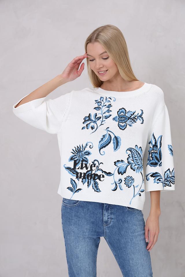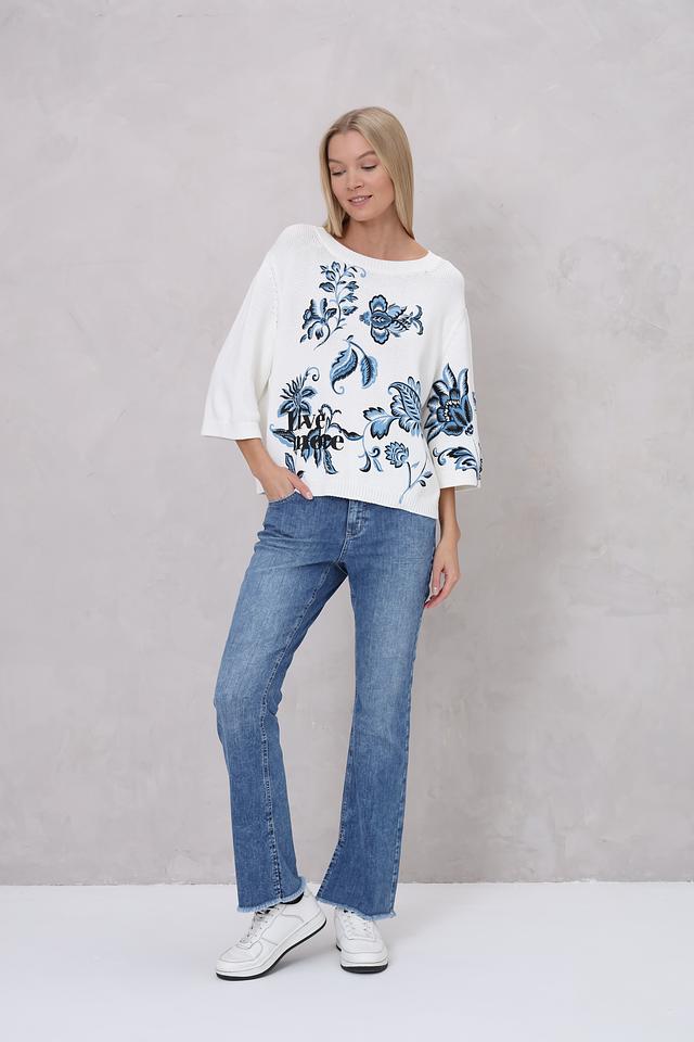 Этот стильный пуловер от Monari выполнен в белом цвете и украшен эффектным цветочным принтом в синих тонах. Модель имеет свободный крой, который обеспечивает комфорт в носке, и рукава три четверти, что делает его универсальным для различных образов.