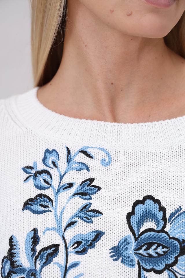 Пуловер изготовлен из 100% хлопка, что гарантирует мягкость, приятные тактильные ощущения и воздухопроницаемость. Он идеально подойдет для создания повседневных и более нарядных луков. Декоративные элементы в виде цветочного принта придают изделию особую изысканность.