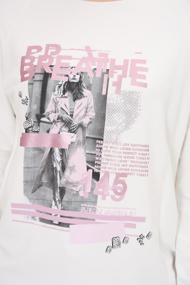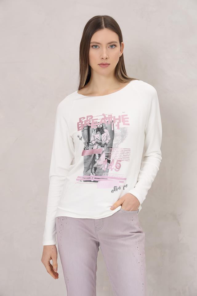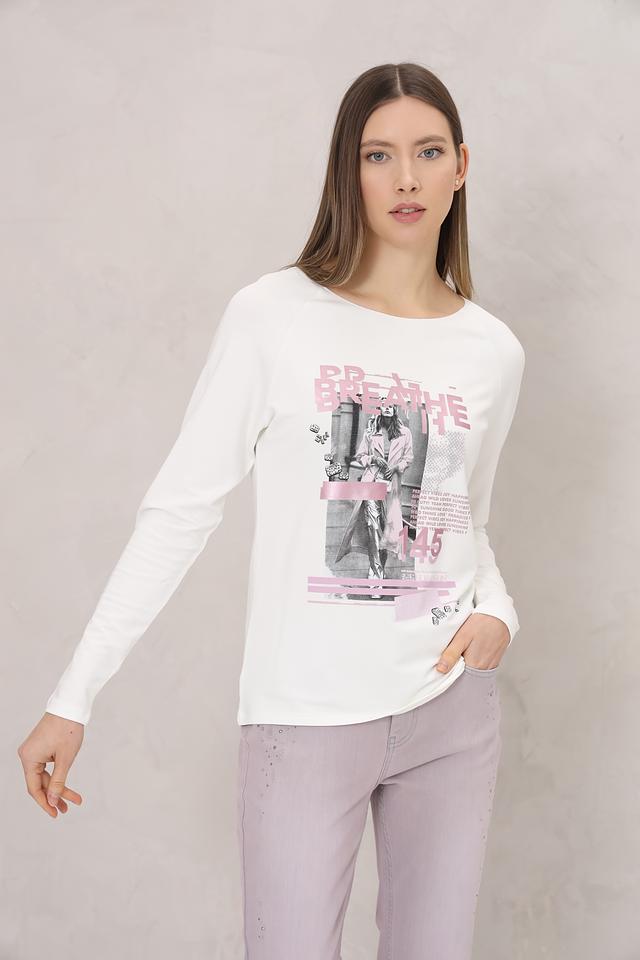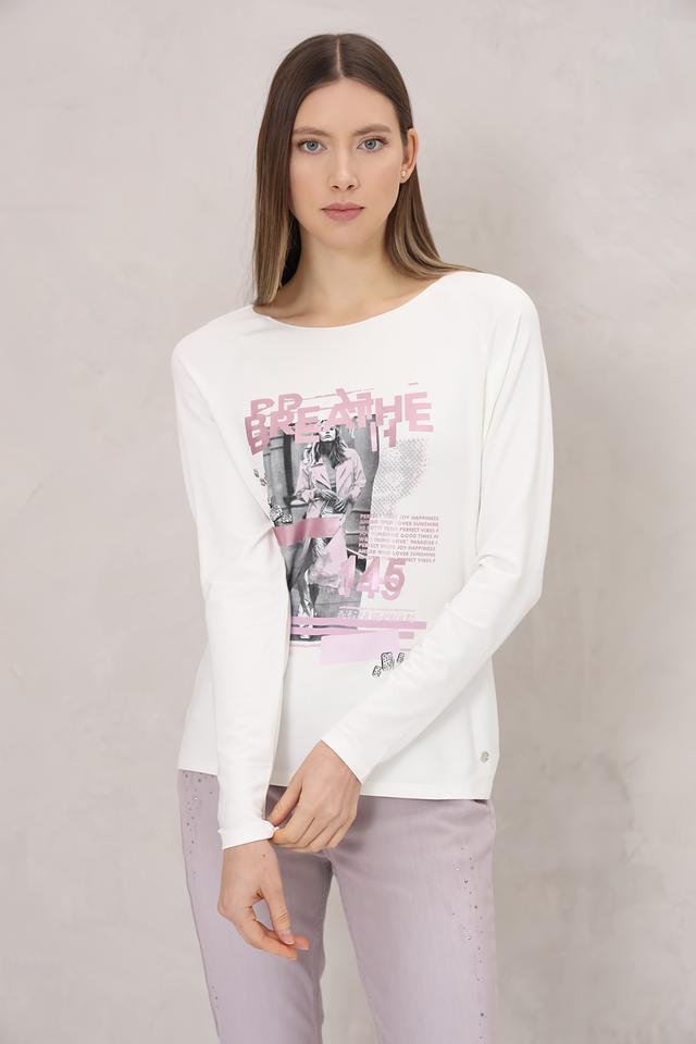 Этот лонгслив от Monari станет отличным дополнением к вашему гардеробу. Выполненный в белом цвете, он украшен эффектным принтом с изображением девушки и надписями.