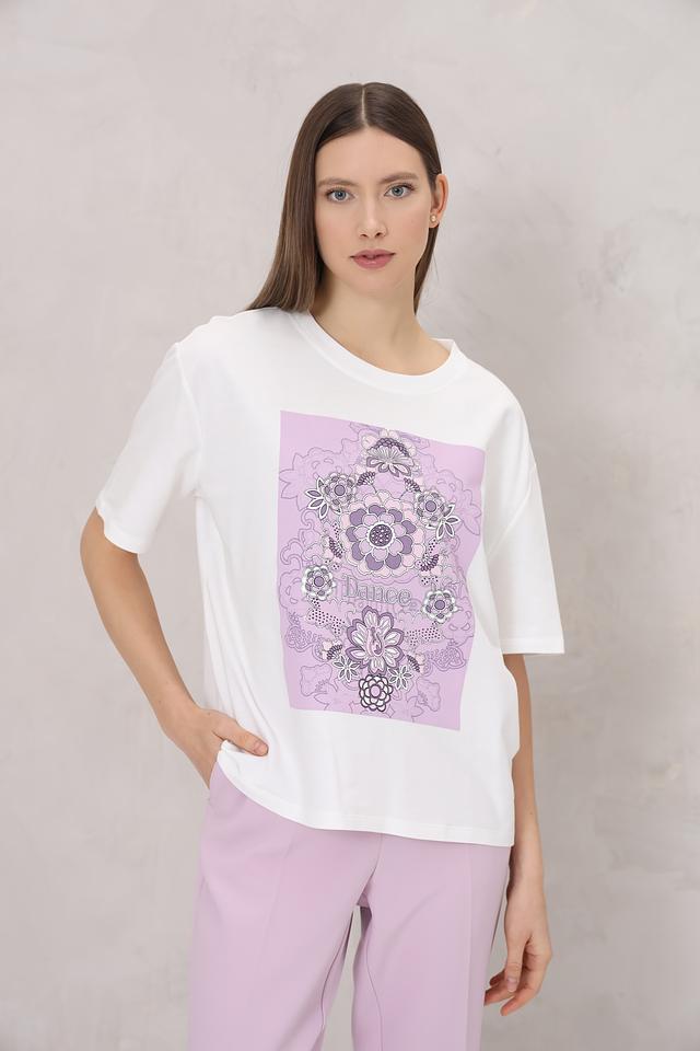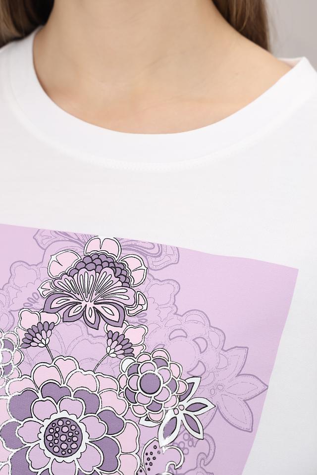 Белая футболка Monari с ярким цветочным принтом в лиловых тонах станет стильным дополнением к вашему гардеробу. Модель свободного кроя из мягкого хлопка и модала обеспечит комфорт в течение дня. Состав: хлопок 50%, модал 50%