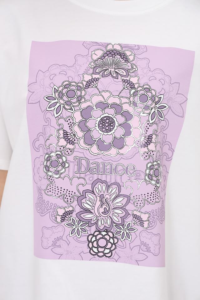 Особенностью данной футболки является крупный цветочный принт в нежных лиловых оттенках, расположенный на передней части изделия. Принт выполнен в графичном стиле, добавляя современности образу. Футболка имеет свободный крой, который не сковывает движений и позволяет создать расслабленный силуэт.