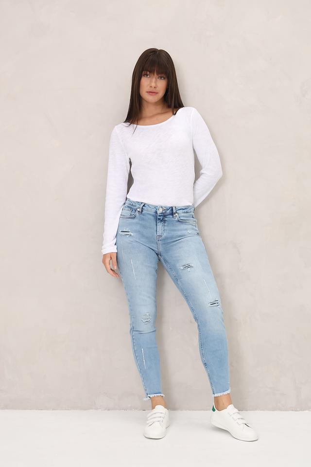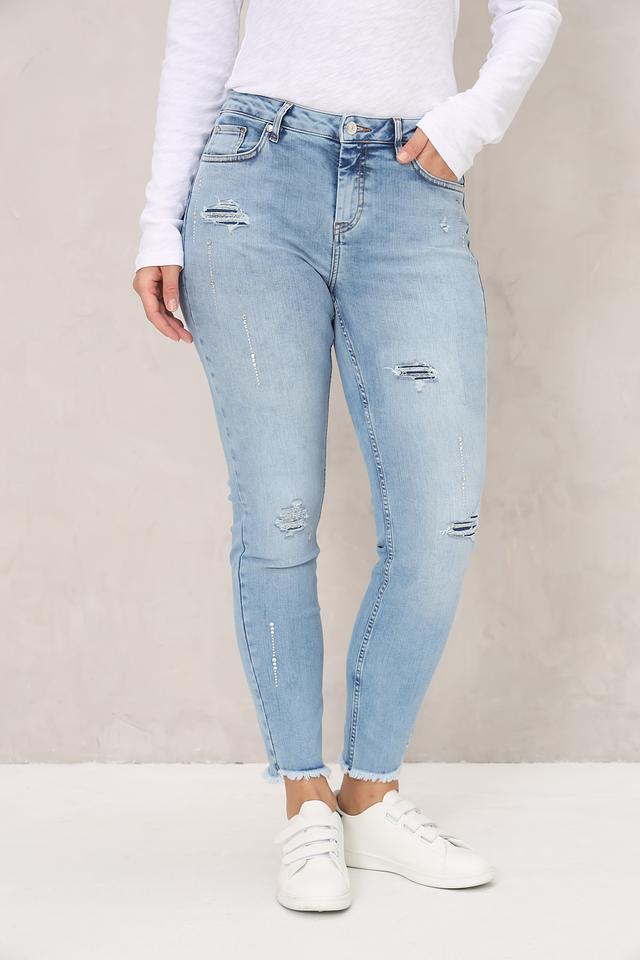 Женские джинсы Monari голубого цвета с эффектом потертостей и необработанным краем. Модель выполнена из хлопка с добавлением полиэстера и эластана для комфорта и лучшей посадки. Состав: хлопок 90%, полиэстер 7%, эластан 3%