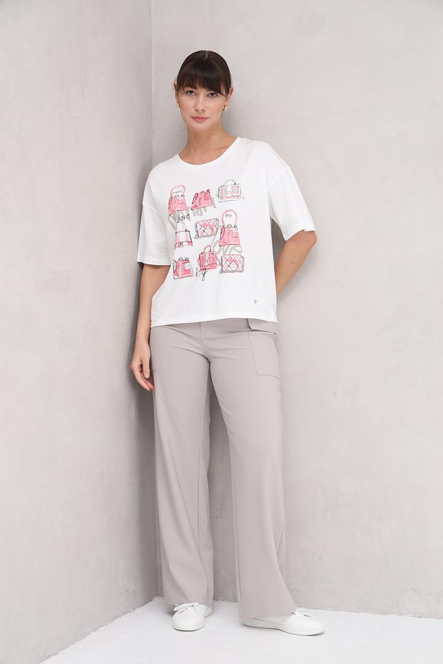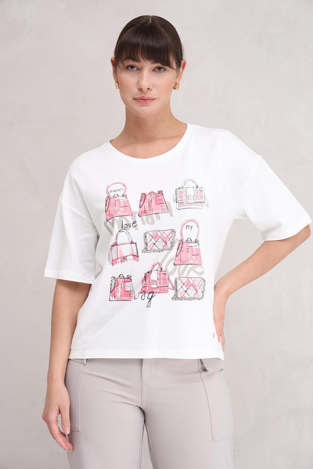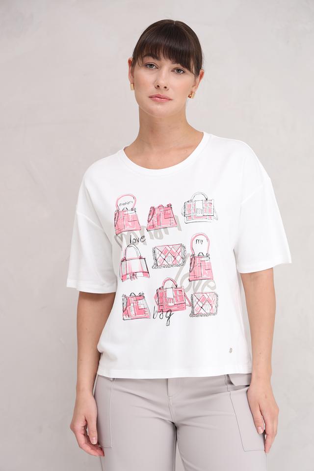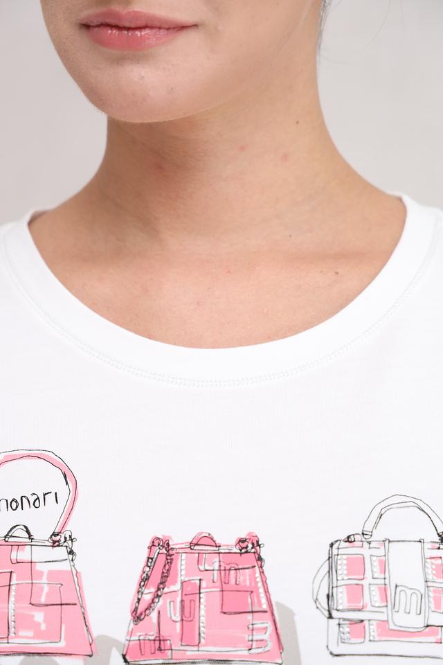 Белая футболка Monari с ярким принтом сумок в розовых тонах. Модель свободного кроя из мягкого хлопка с модалом, идеально подходит для создания повседневных образов. Состав: хлопок 50%, модал 50%