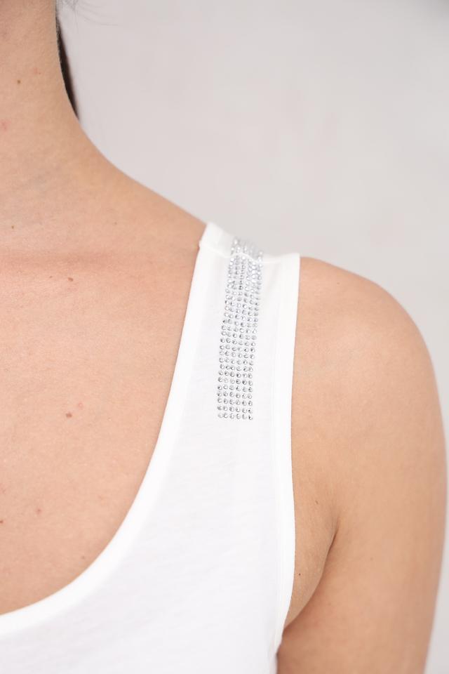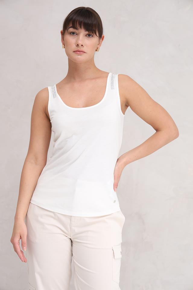 Белый топ Monari — это стильная и удобная базовая вещь с изящным декором на бретелях. Модель выполнена из мягкого и приятного к телу сочетания хлопка и модала, обеспечивающего комфорт в течение всего дня. Состав: хлопок 50%, модал 50%