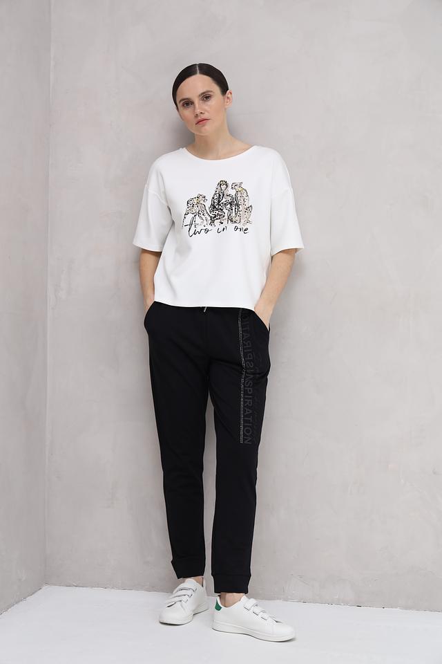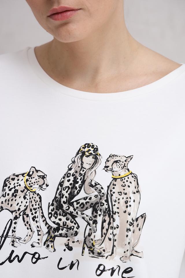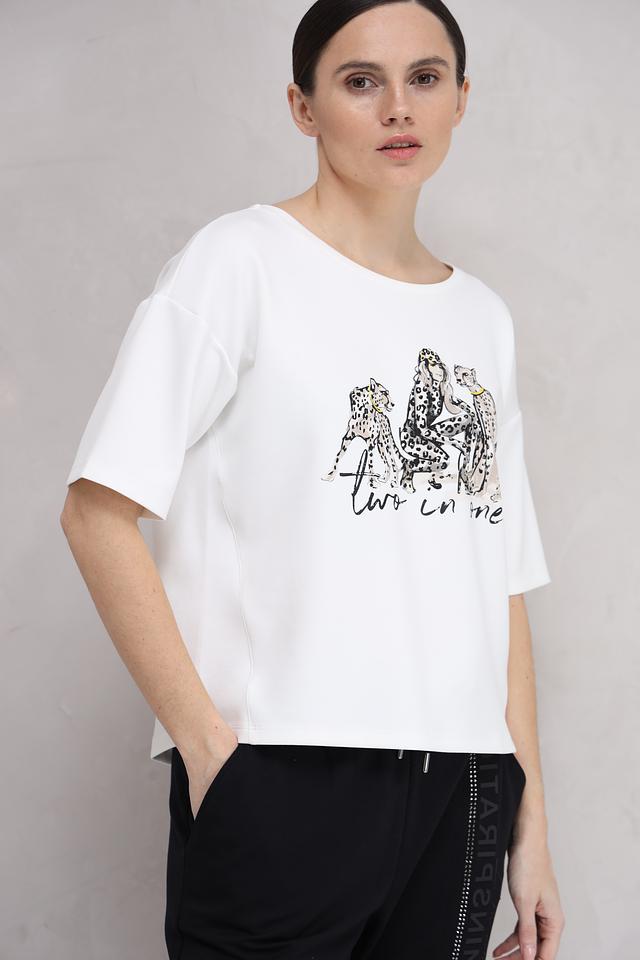 Особенностью данной футболки является яркий принт с изображением леопардов и девушки в леопардовом наряде, сопровождаемый надписью "Two in One". Принт выполнен в контрастных черных тонах, что делает его заметным и привлекательным.