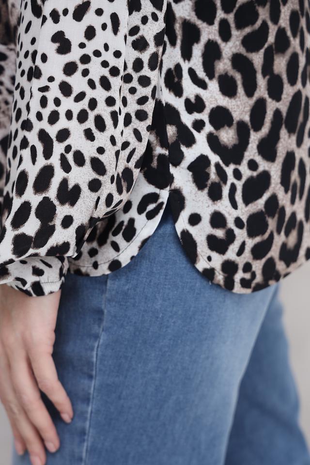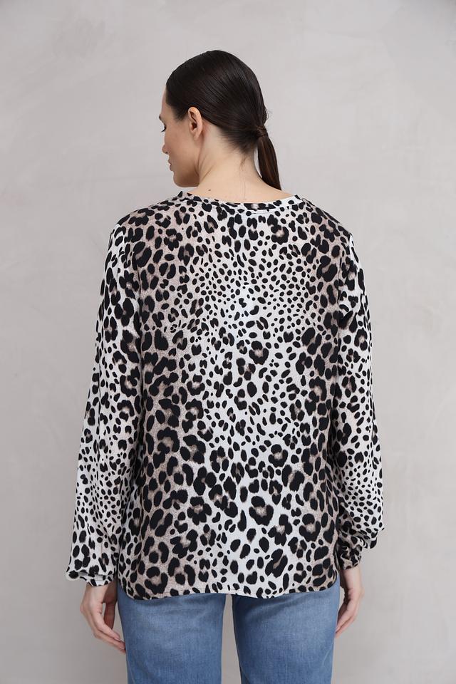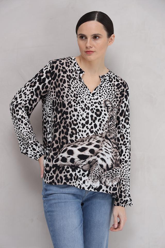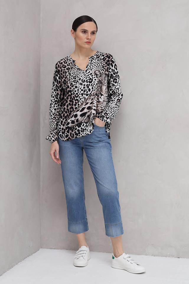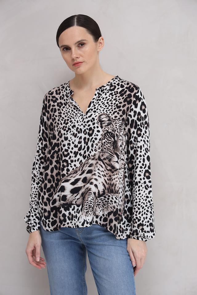 Основной цвет блузы – белый, но ее украшает эффектный леопардовый принт, который придает ей динамичный и стильный вид. V-образный вырез подчеркивает линию шеи и делает образ более женственным.