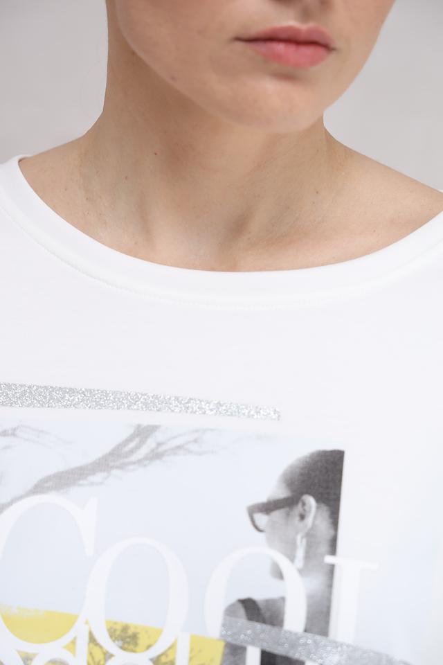 Белый лонгслив Monari с оригинальным принтом – стильное и комфортное решение для повседневного образа. Модель выполнена из мягкого трикотажа с добавлением вискозы и эластана, обеспечивающего удобную посадку. Состав: полиэстер 55%, вискоза 38%, эластан 7%