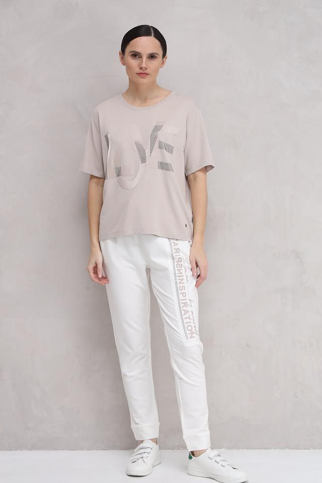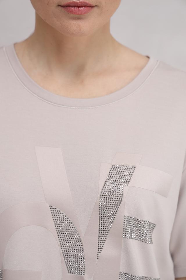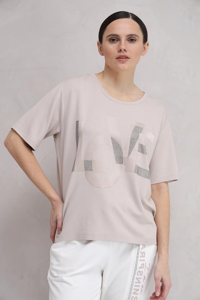 Женская футболка Monari бежевого цвета с актуальной надписью "LOVE", выполненная из мягкого и приятного к телу трикотажа. Стильный крой и декор стразами придают модели особый шарм. Состав: вискоза 45%, модал 45%, эластан 10%
