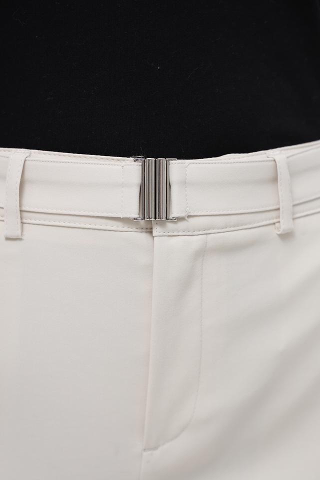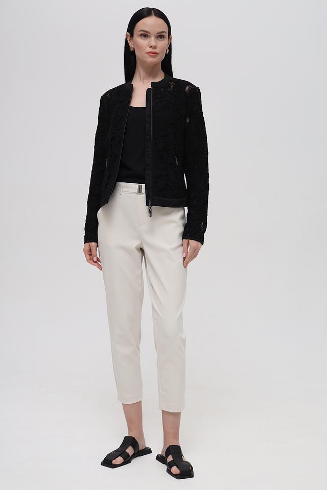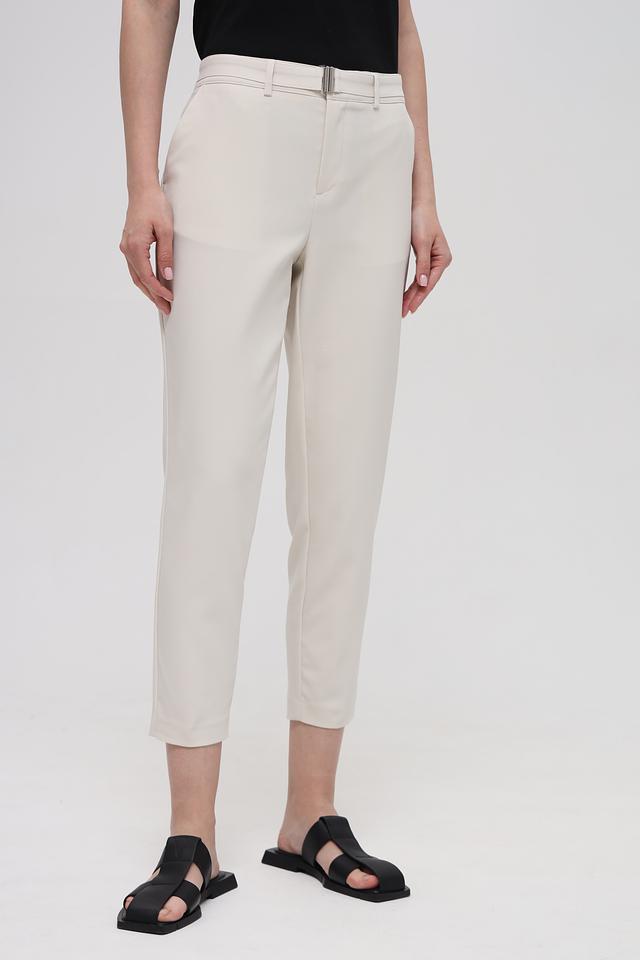 Брюки имеют прямой крой и укороченную длину, что делает их актуальными и современными. Пояс с металлической пряжкой добавляет изысканности и подчеркивает талию. Качество материалов гарантирует комфорт и долговечность изделия.