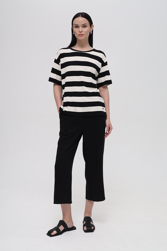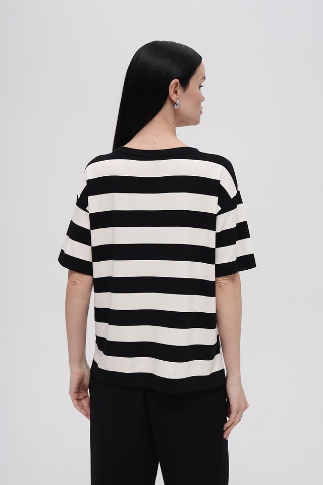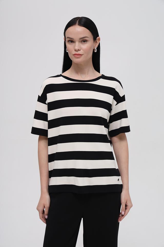 Женская футболка Monari чёрно-белого цвета с классическим полосатым принтом. Изготовлена из мягкой вискозы с добавлением полиэстера и эластана для комфорта и хорошей посадки. Состав: вискоза 80%, полиэстер 15%, эластан 5%
