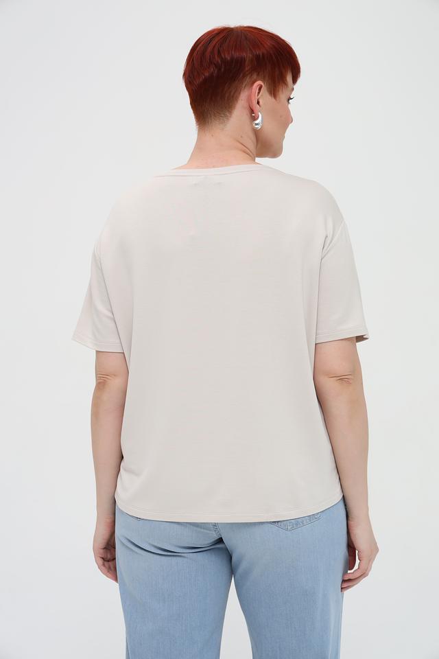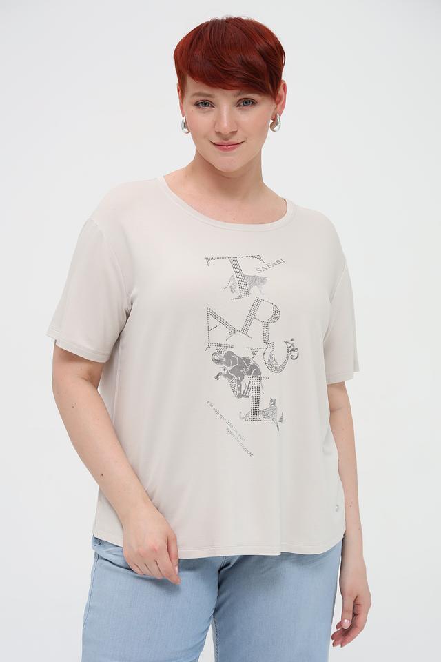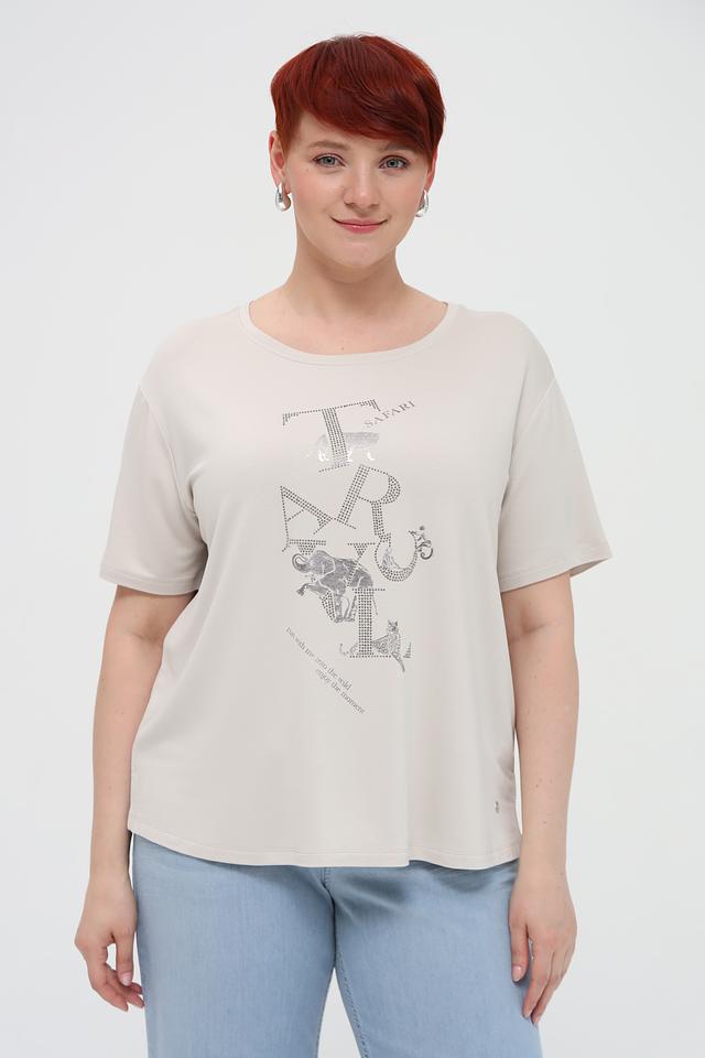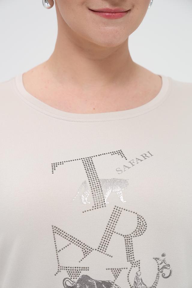 Женская футболка Monari бежевого цвета с оригинальным принтом в виде силуэтов животных и декоративной отделкой стразами. Модель свободного кроя из мягкой и приятной к телу ткани. Состав: вискоза 45%, модал 45%, эластан 10%
