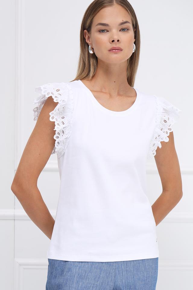 Белая футболка Monari с изящным кружевным декором на рукавах. Модель выполнена из мягкого хлопка с добавлением эластана для комфортной посадки и свободы движений. Идеальный выбор для создания стильного и женственного образа. Состав: хлопок 94%, эластан 6%