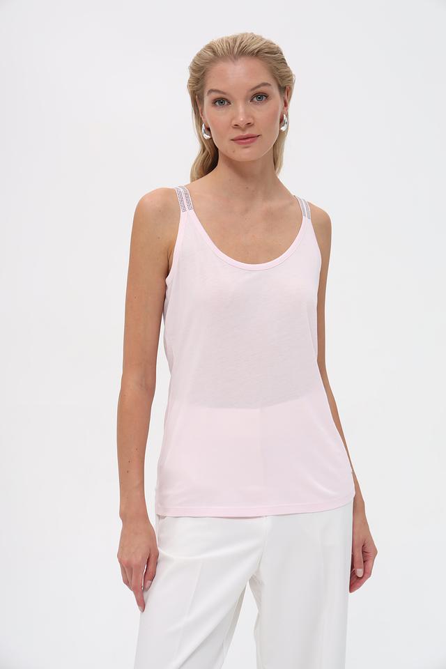 Модель имеет классический крой с тонкими бретелями и округлым вырезом. Бретели декорированы небольшими стразами, которые придают топу изысканность и блеск.