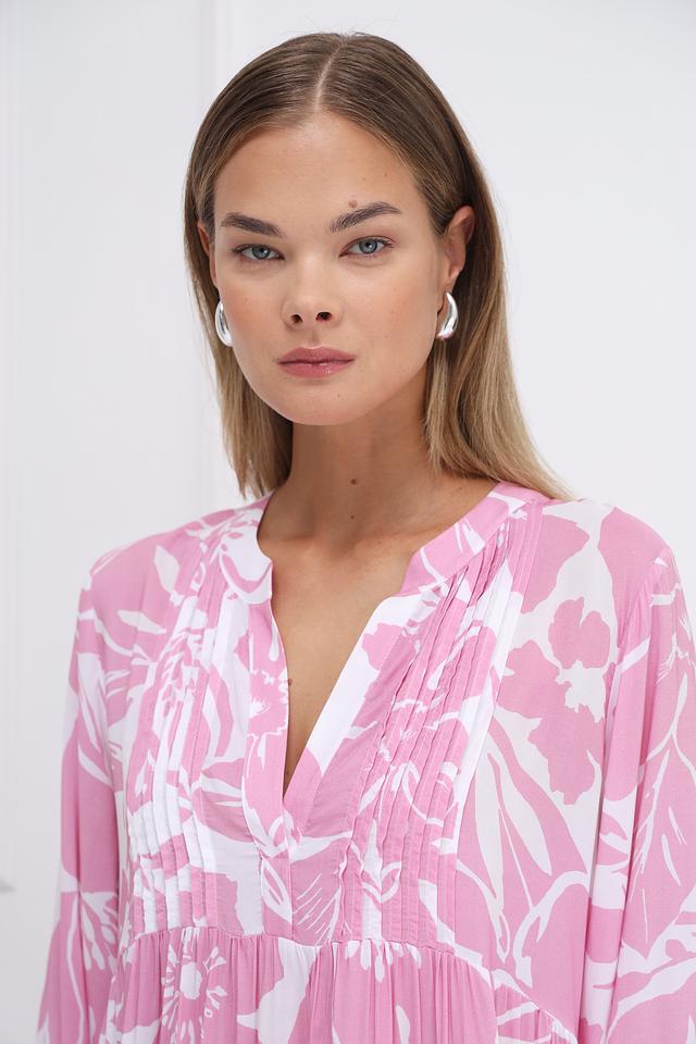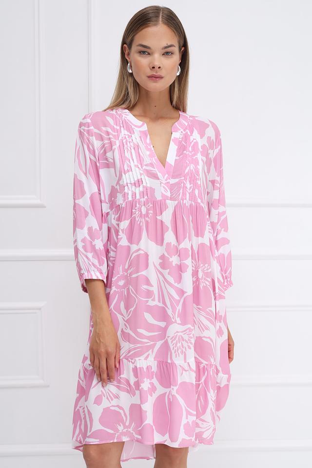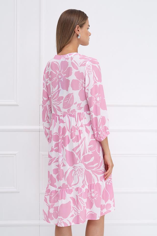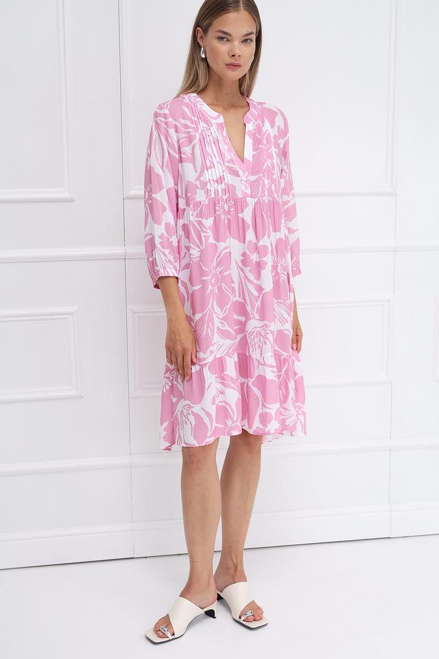 Платье Monari нежно-розового цвета с ярким цветочным принтом станет отличным выбором для создания романтичного образа. Легкая вискоза обеспечивает комфорт в жаркую погоду, а свободный крой не сковывает движений. Состав: вискоза 100%