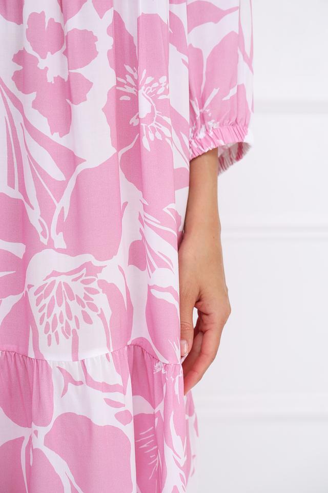 Это стильное платье от бренда Monari выполнено из 100% вискозы, что делает его приятным на ощупь и комфортным в носке. Преобладающий цвет – нежно-розовый, дополненный ярким цветочным принтом, который придает образу свежесть и легкость.