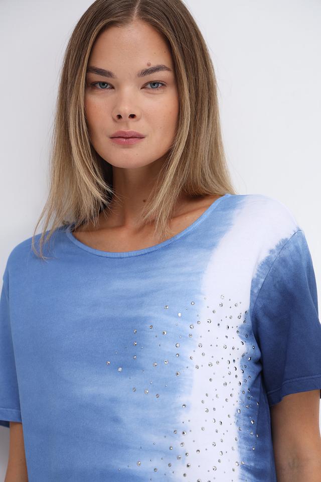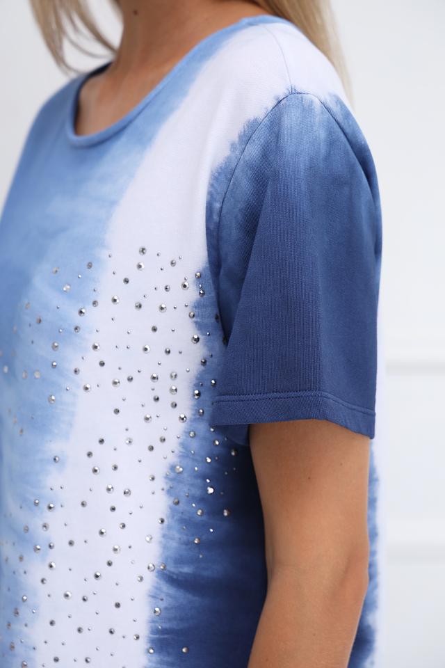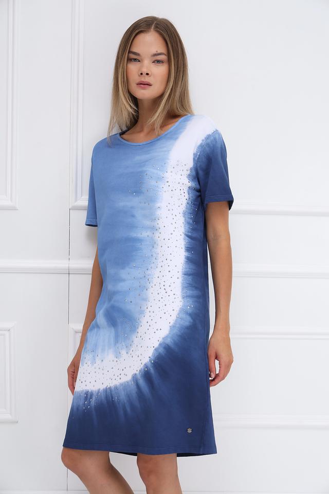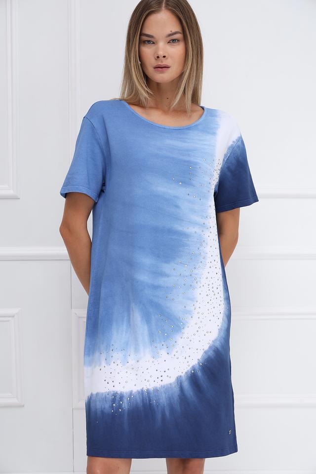 Особенностью этого платья является эффектный принт в технике tie-dye, сочетающий различные оттенки голубого и белого. Дополнительный декор в виде страз придает изделию изысканность и привлекает внимание.