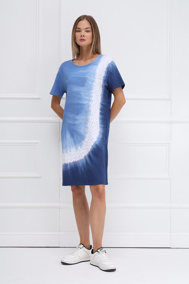 Платье Monari голубого цвета в технике tie-dye с отделкой стразами – стильное и комфортное решение для повседневного образа. Модель свободного кроя из 100% хлопка обеспечит удобство в носке. Состав: хлопок 100%
