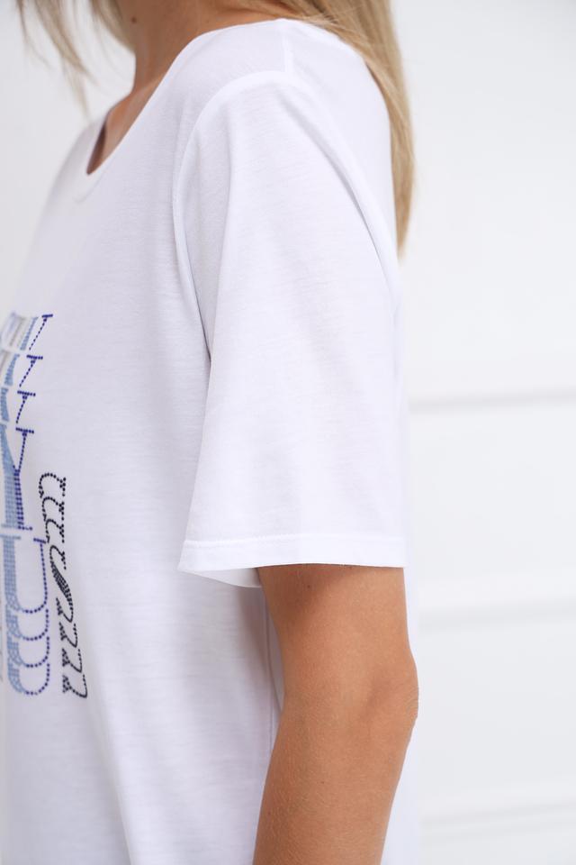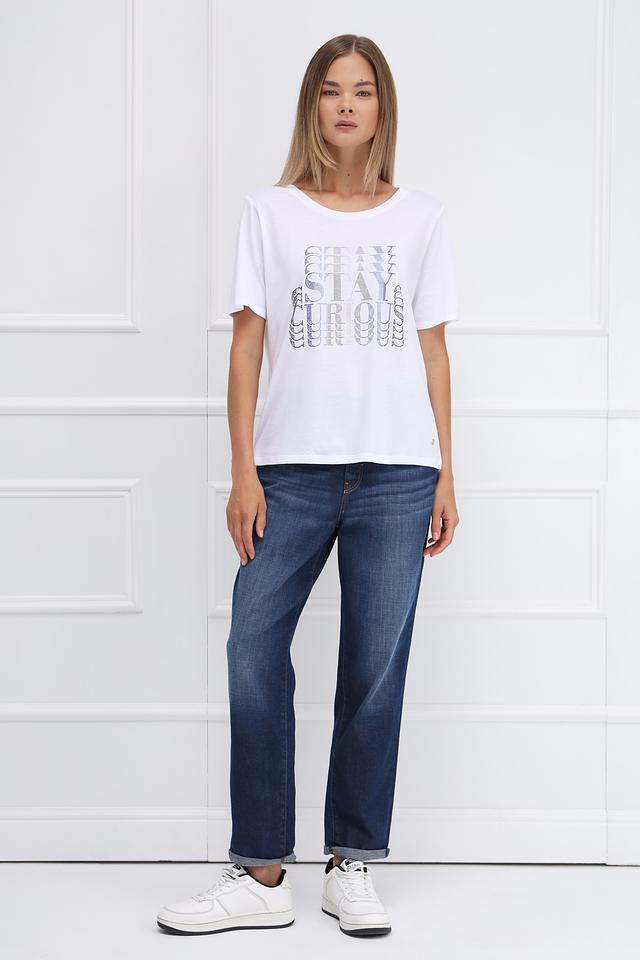 Белая футболка Monari с оригинальным принтом "Stay Curious" станет стильным дополнением к вашему гардеробу. Изготовлена из мягкого хлопка с модалом, обеспечивающего комфорт в носке. Состав: хлопок 50%, модал 50%