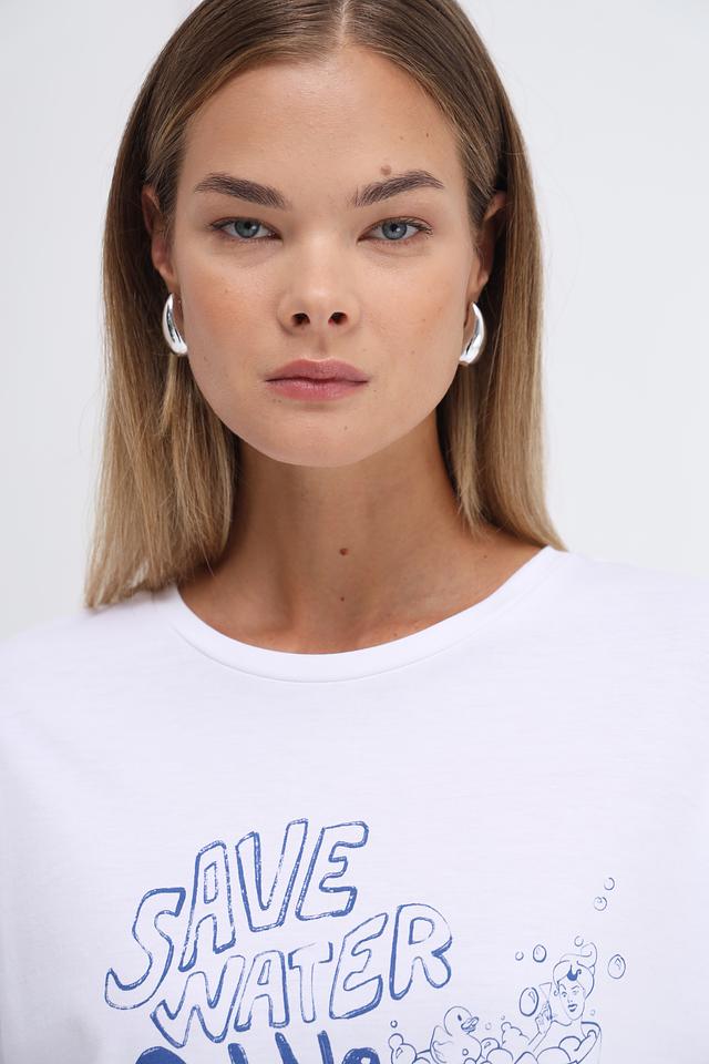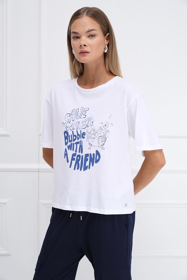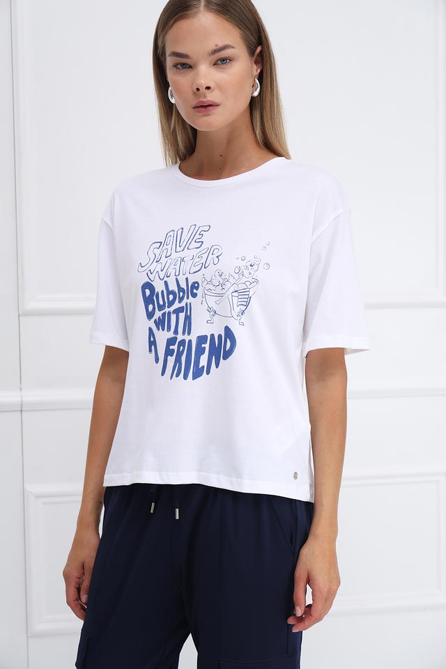 Белая футболка Monari с оригинальным принтом "Save Water Bubble With A Friend" станет стильным дополнением к вашему образу. Модель выполнена из 100% хлопка, обеспечивая комфорт в носке. Состав: хлопок 100%