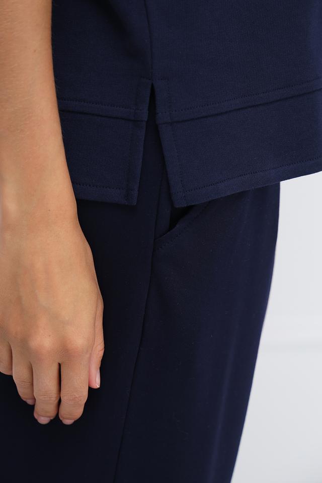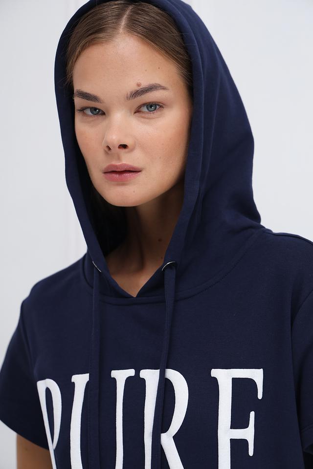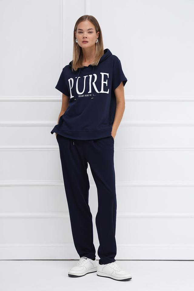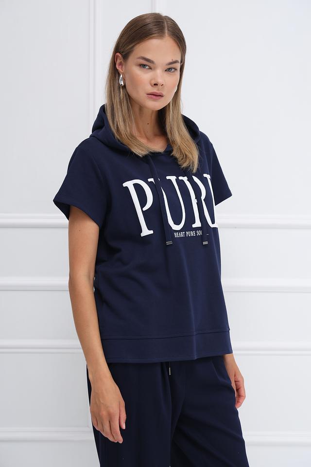 Синий пуловер Monari с коротким рукавом и капюшоном украшен белой надписью "PURE". Модель выполнена из мягкого хлопка и идеально подходит для создания комфортных и стильных образов. Состав: хлопок 100%