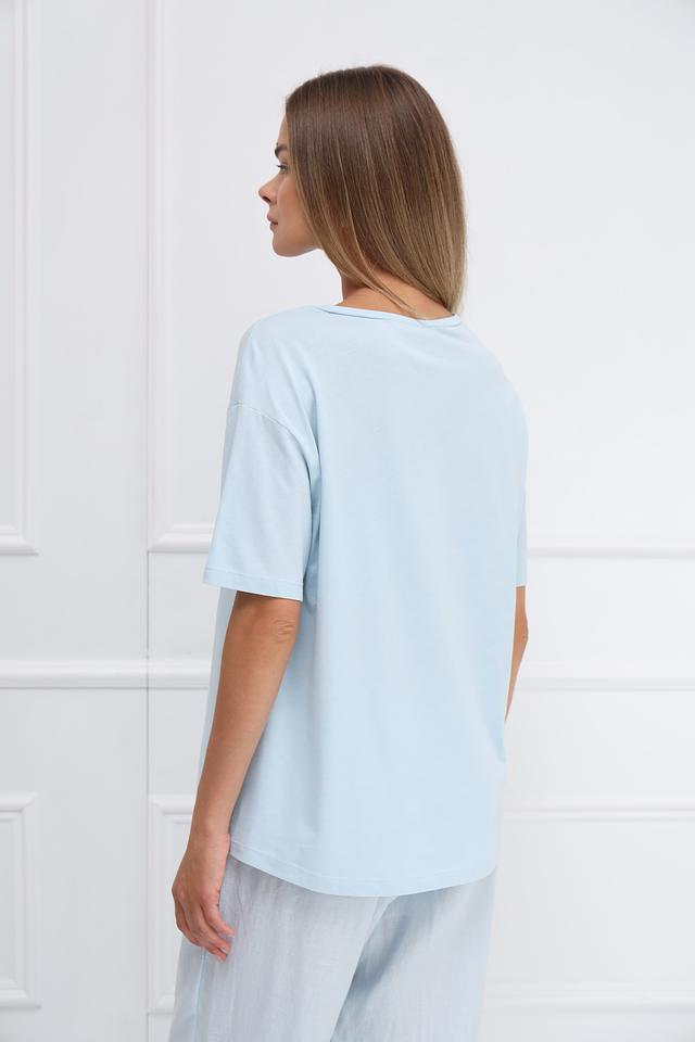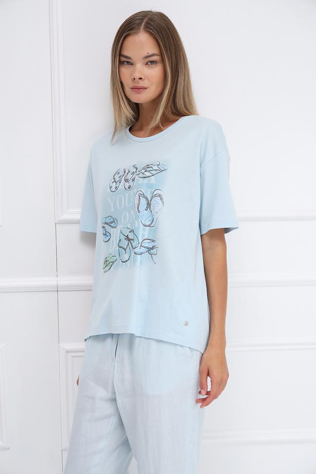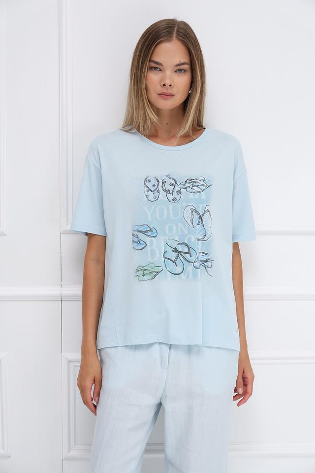 Голубая футболка Monari с оригинальным принтом в виде губ станет стильным дополнением к вашему образу. Модель свободного кроя выполнена из мягкого хлопка с модалом, обеспечивающего комфорт в носке. Состав: хлопок 50%, модал 50%