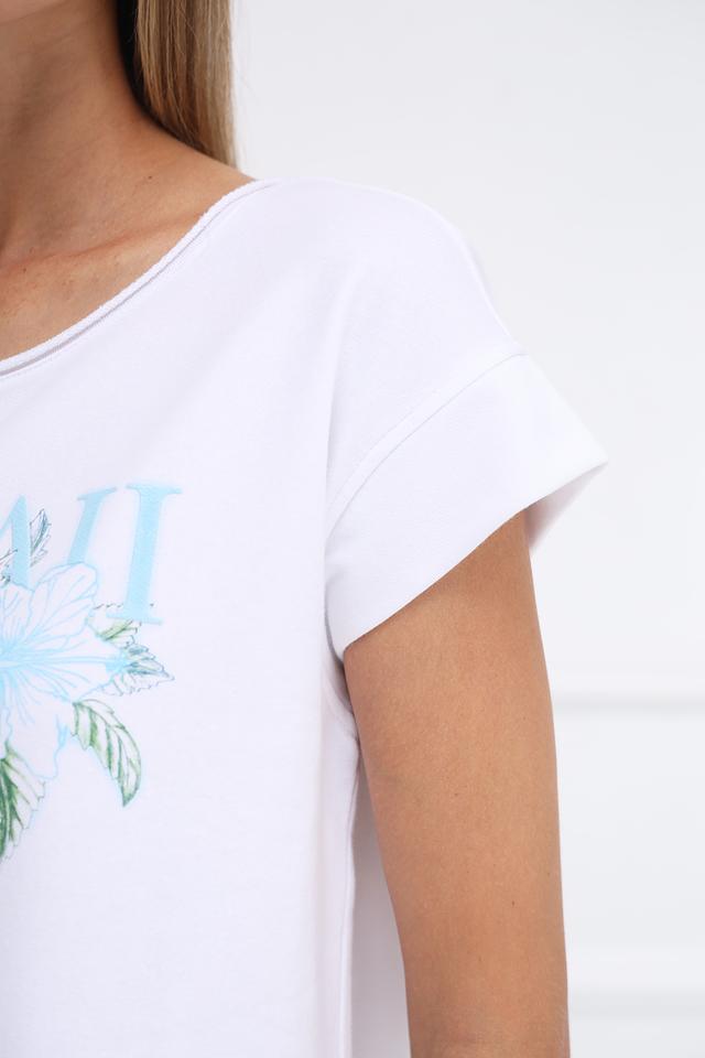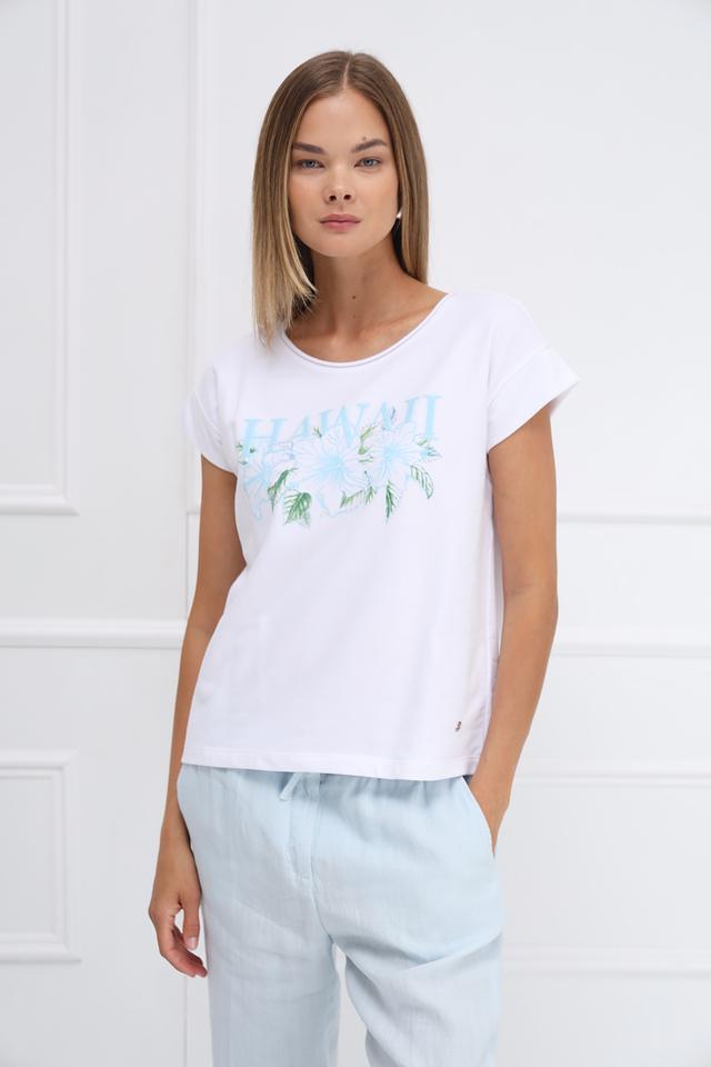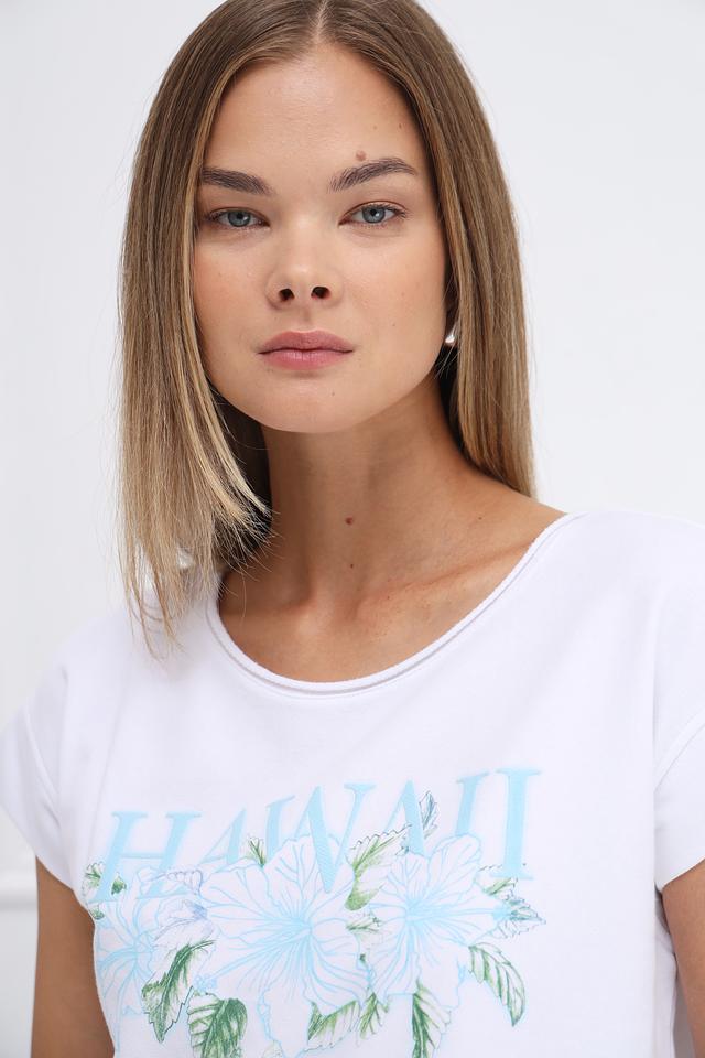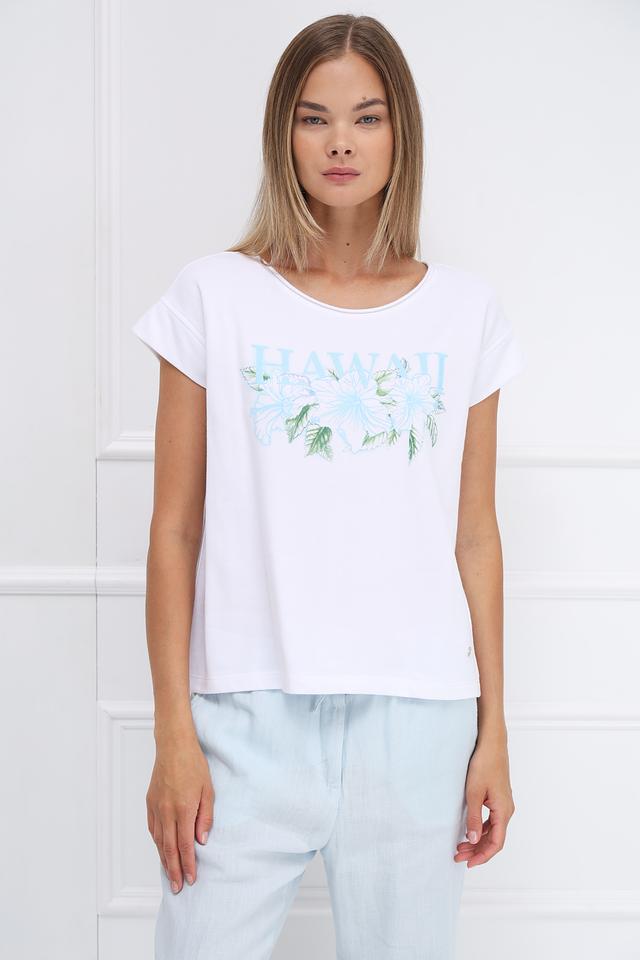 Эта стильная футболка от Monari выполнена в белом цвете и украшена эффектным принтом "Hawaii", изображающим тропические цветы и надпись. Футболка имеет прямой крой и короткие рукава с небольшим отворотом, что придает ей непринужденный и современный вид.