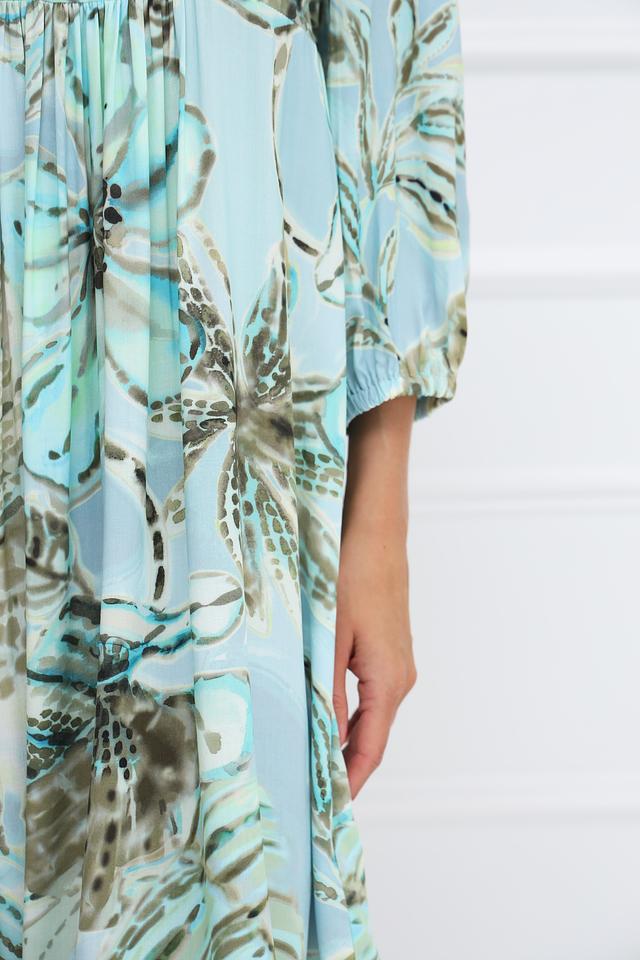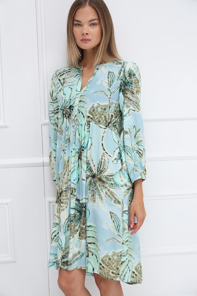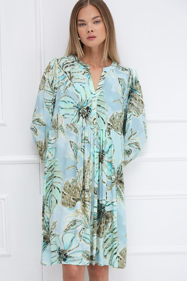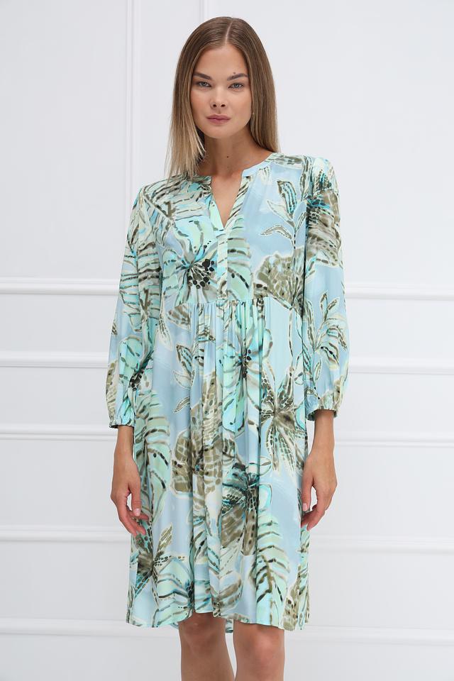 Основной цвет платья – нежный голубой, который служит прекрасным фоном для яркого тропического принта с изображением листьев пальм и других экзотических растений. Сборка на талии создает легкую драпировку и подчеркивает женственность силуэта.