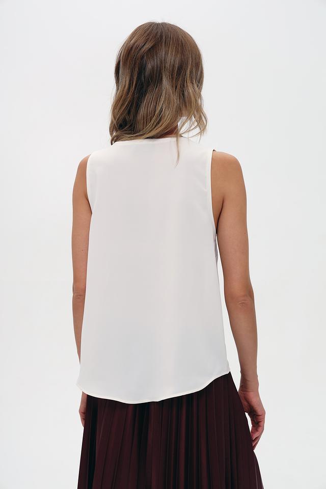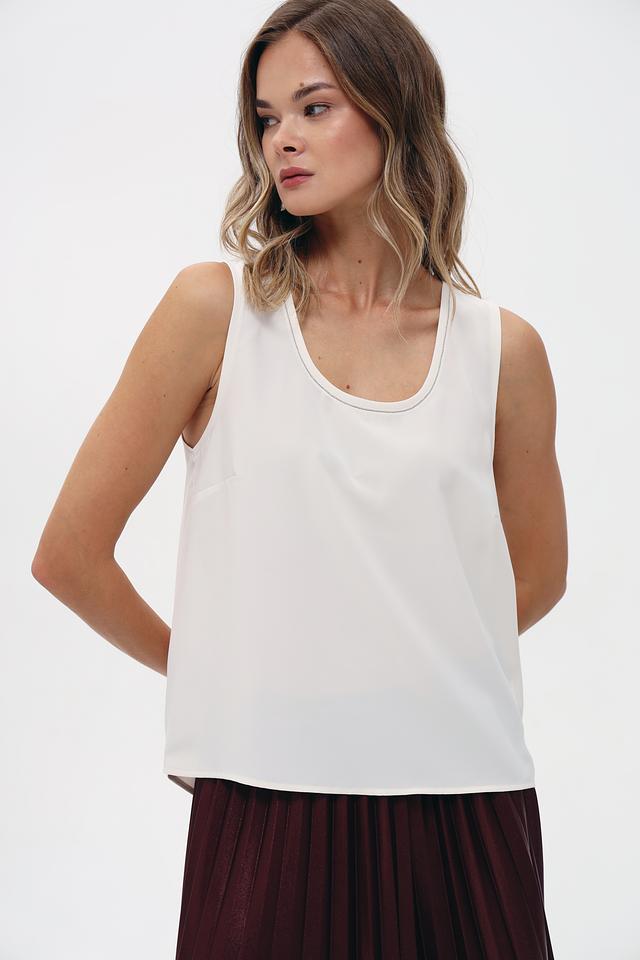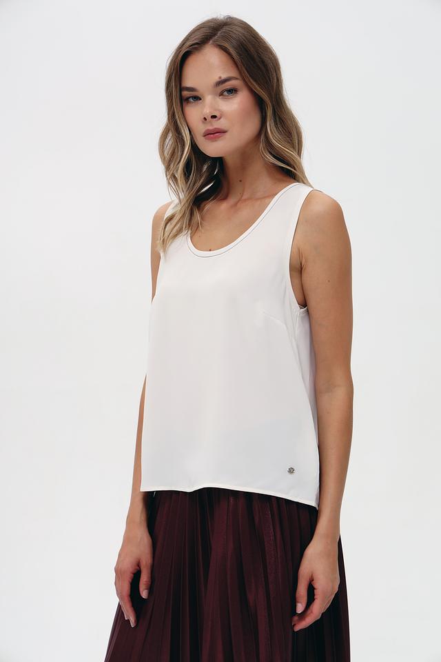 Топ имеет свободный крой и круглый вырез горловины, что обеспечивает комфортную посадку по фигуре. Отсутствие рукавов делает его идеальным выбором для тёплой погоды. Изготовлен из высококачественного полиэстера, который приятен к телу и не требует особого ухода.