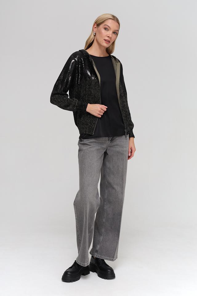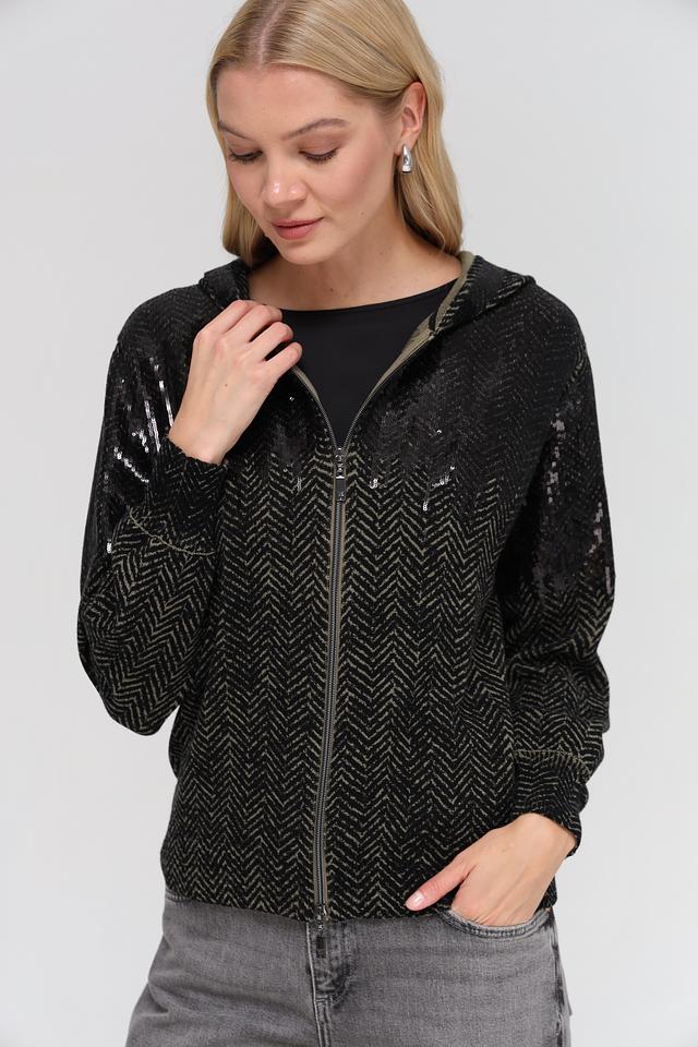 Чёрный жакет Monari с узором в виде ёлочки, выполненный с отделкой из пайеток. Модель с капюшоном и застёжкой-молнией, рукава слегка расклешены. Идеальный выбор для создания стильного и яркого образа. Состав: хлопок 100%
