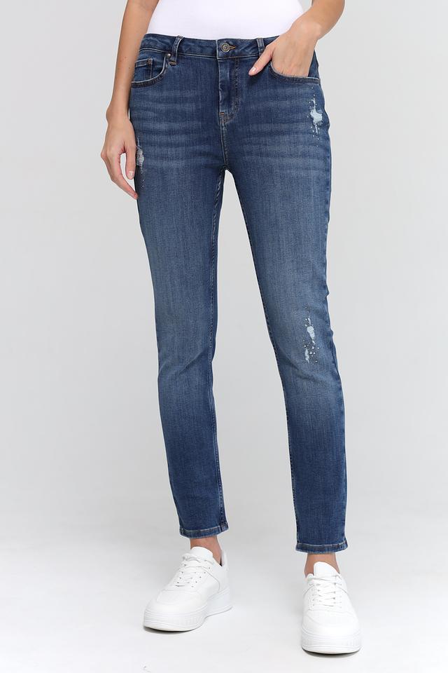 Джинсы украшены небольшими разрезами на передней части штанин, добавляющими им непринужденности и актуальности. Ткань состоит из хлопка (80%), полиэстера (17%) и эластана (3%), что обеспечивает удобство в носке, хорошую форму и небольшую эластичность.
