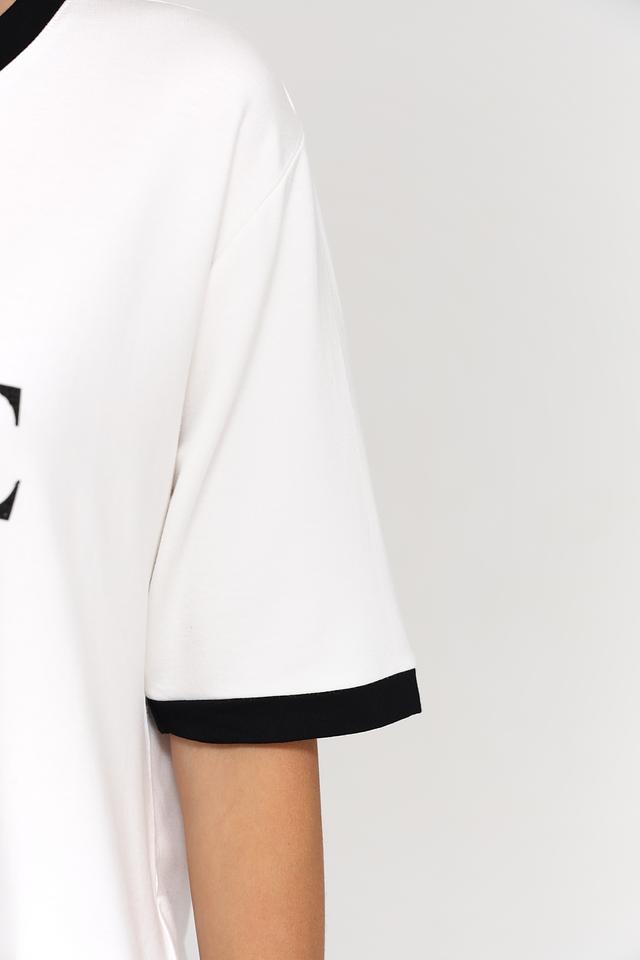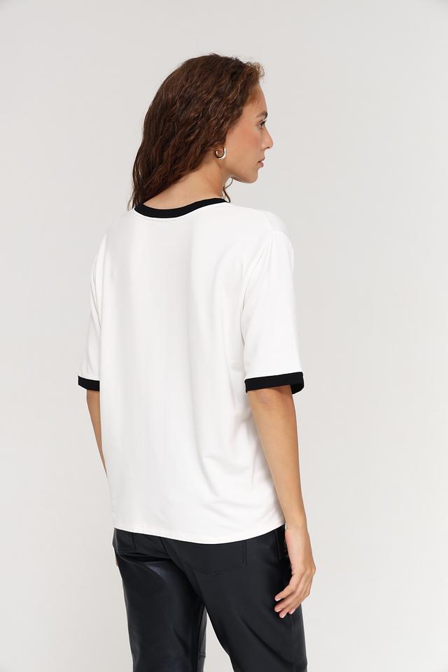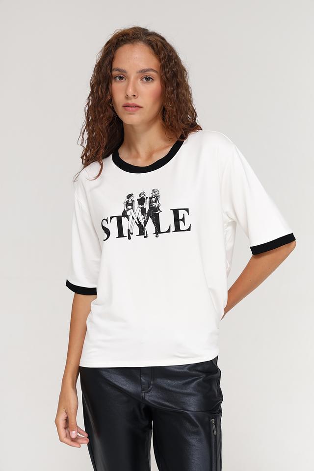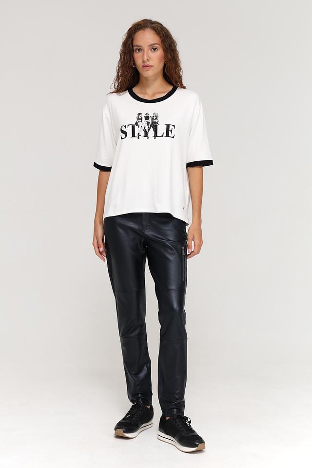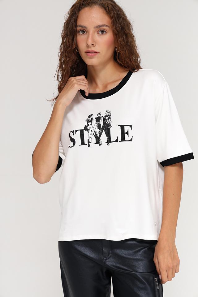 Белая футболка Monari с короткими рукавами и чёрной отделкой. Модель украшена принтом "STYLE", что придает ей стильный и современный вид. Изготовлена из мягкой вискозы с добавлением эластана. Состав: вискоза 95%, эластан 5%