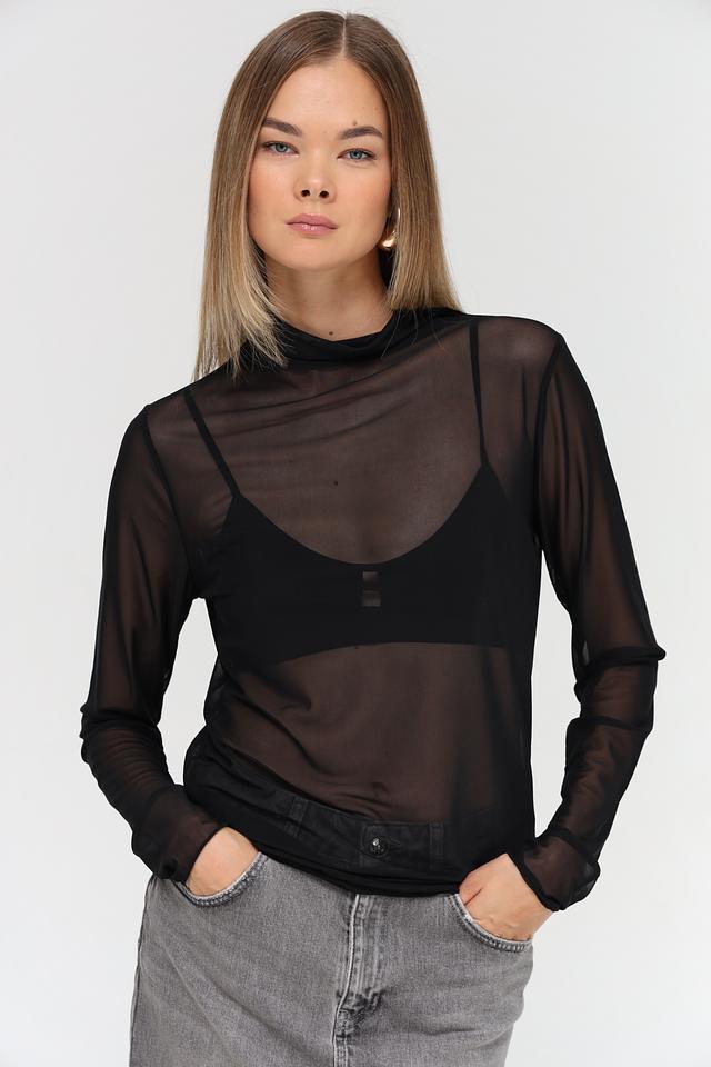 Чёрный пуловер от Monari из полупрозрачной ткани с длинным рукавом и высоким горлом. Элегантная модель, идеально подходящая для создания многослойных образов и добавления изысканности в ваш гардероб. Состав: полиэстер 92%, эластан 8%