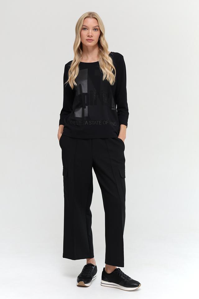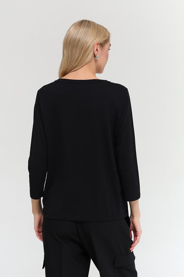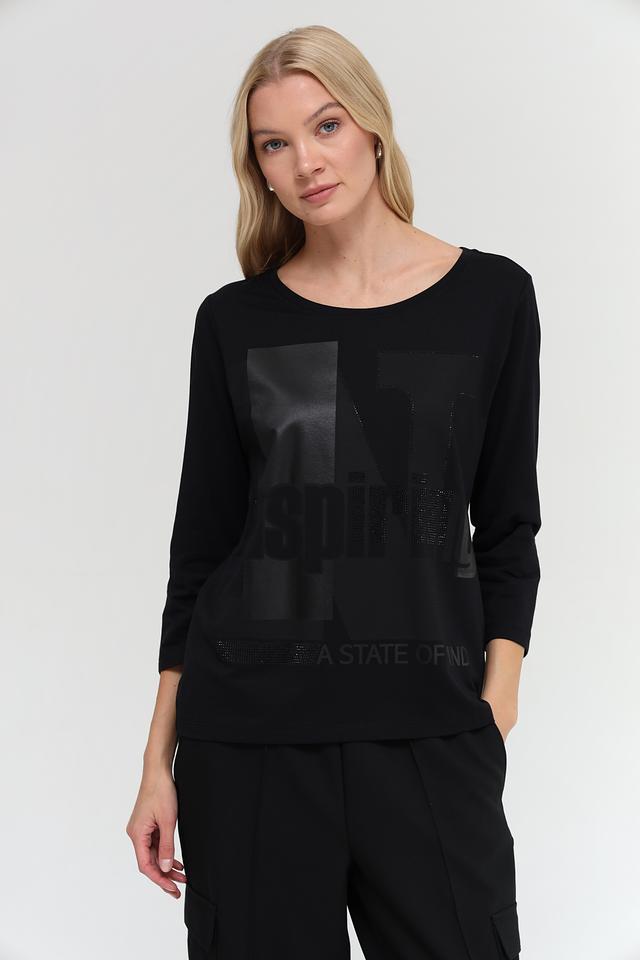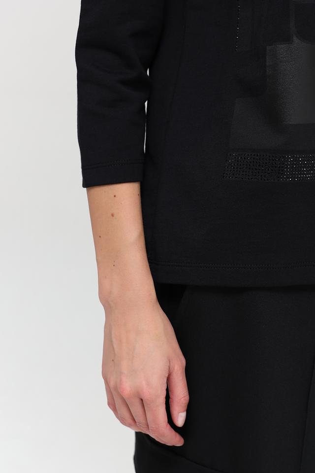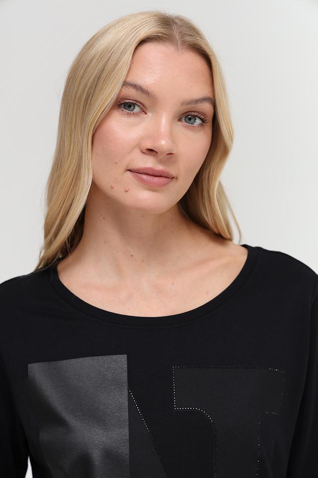 Чёрная футболка Monari с оригинальным принтом и рукавом 3/4. Изготовлена из мягкого хлопка с модалом для комфорта и приятных ощущений. Идеальный выбор для создания стильного повседневного образа. Состав: хлопок 50%, модал 50%