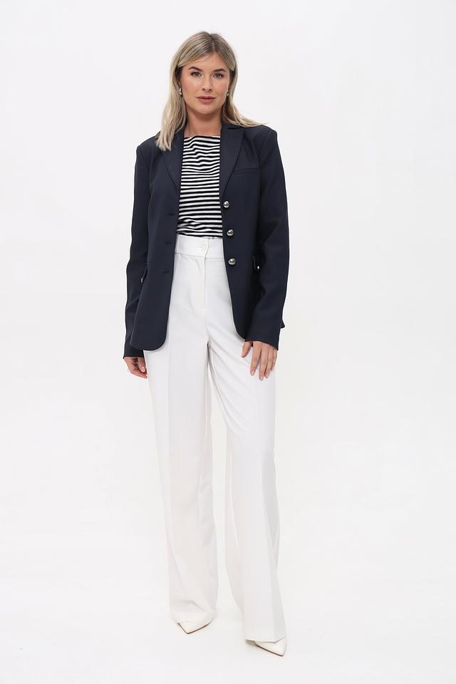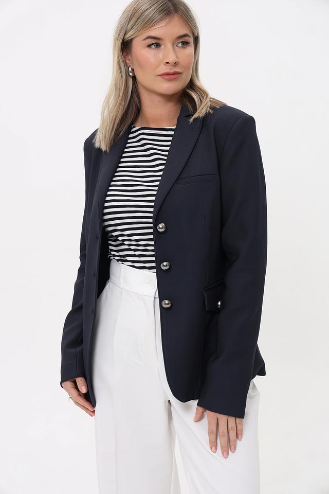 Застёжка на три металлические пуговицы золотистого оттенка добавляет жакету изысканности. Модель дополнена двумя накладными карманами с клапанами. Плечи слегка расширены, что придает жакету современный вид.