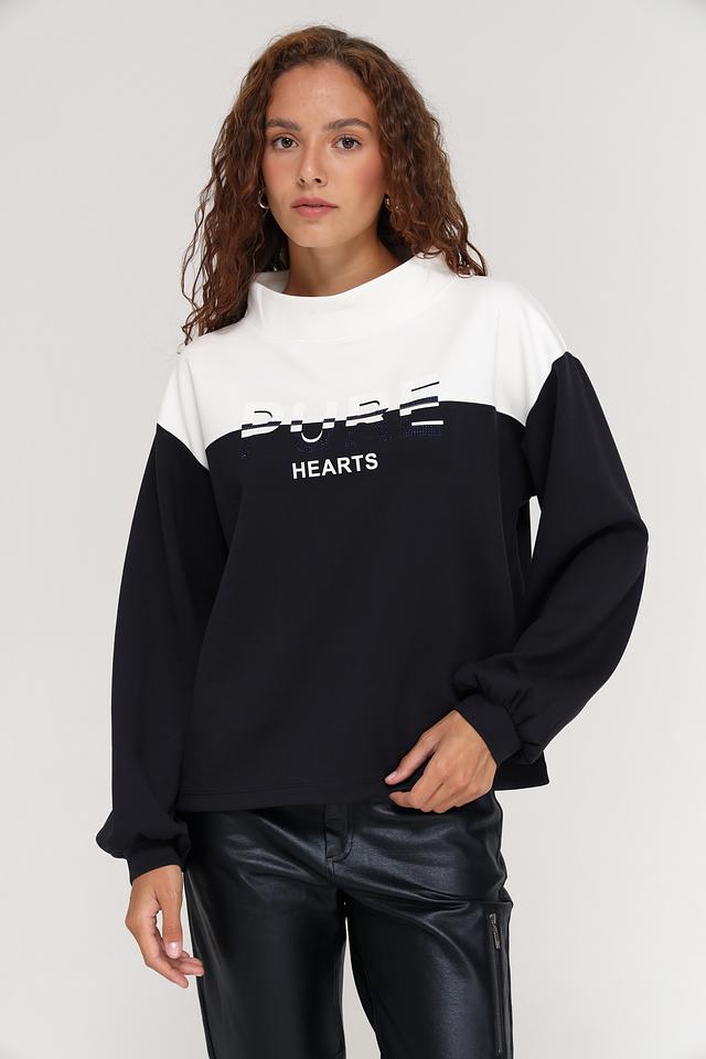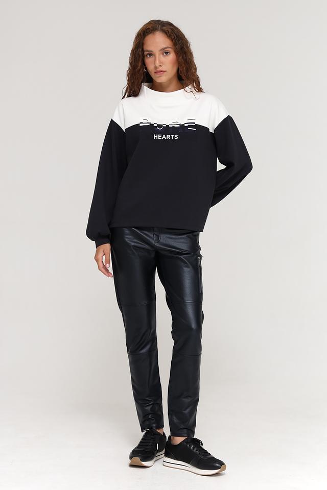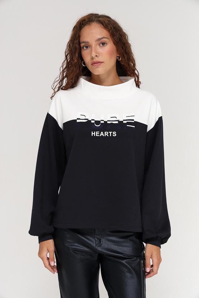 Стильный пуловер Monari чёрно-белого цвета с яркой надписью "PURE HEARTS". Модель выполнена из мягкого трикотажа с добавлением вискозы и эластана, обеспечивающего комфорт и свободу движений. Состав: полиэстер 55%, вискоза 38%, эластан 7%