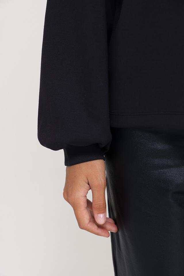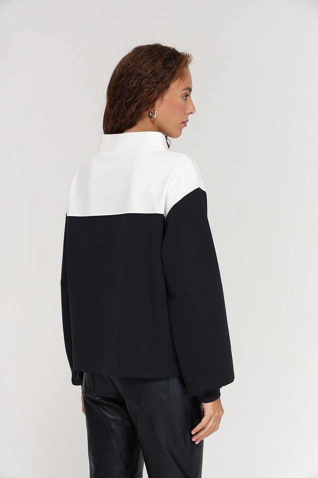 Пуловер выполнен в контрастной цветовой гамме: чёрный цвет сочетается с белым, создавая эффектный образ. Модель имеет свободный крой и слегка завышенную горловину. Рукава объёмные, с манжетами.