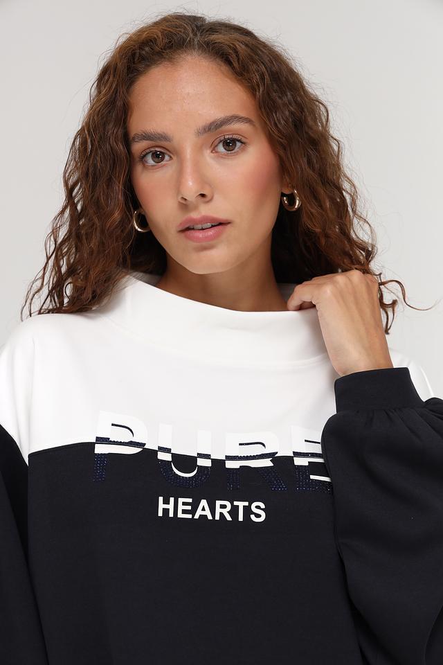 Этот пуловер от Monari станет отличным дополнением к вашему гардеробу. Он сочетает в себе лаконичный дизайн и яркий акцент в виде надписи "PURE HEARTS".