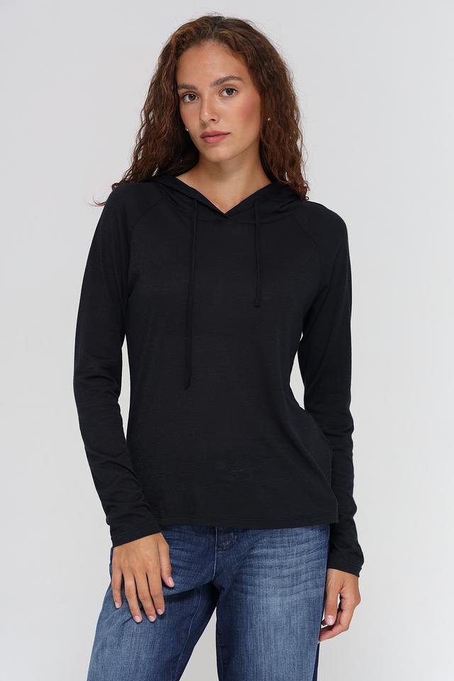 Чёрный пуловер Monari с капюшоном и длинными рукавами – это стильная и комфортная модель на каждый день. Изготовлен из мягкой вискозы с добавлением полиэстера и полиамида, обеспечивающих приятные тактильные ощущения и долговечность. Состав: вискоза 75%, метализ.полиэстер 15%, полиамид 10%