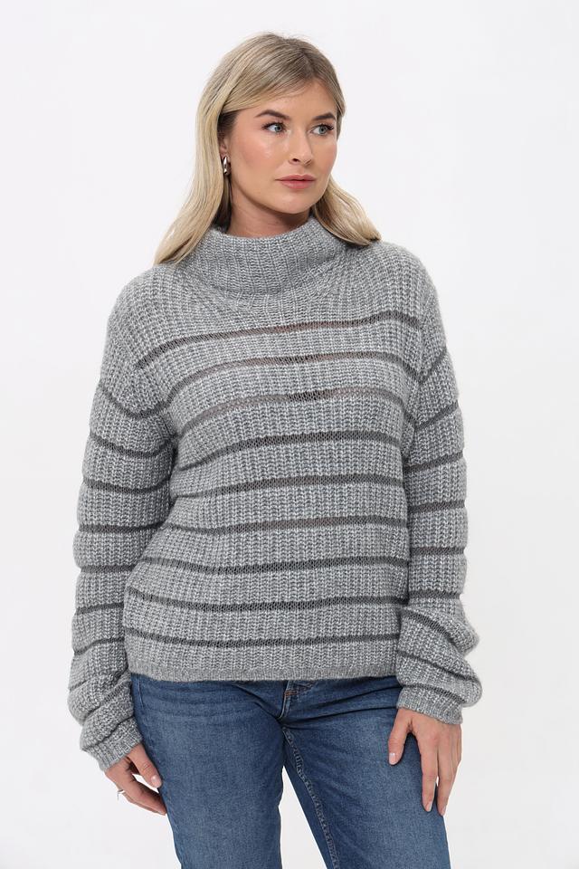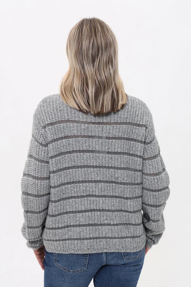 Этот пуловер от Monari станет отличным дополнением к вашему гардеробу. Он выполнен в сером цвете с классическим полосатым узором, который всегда актуален.
