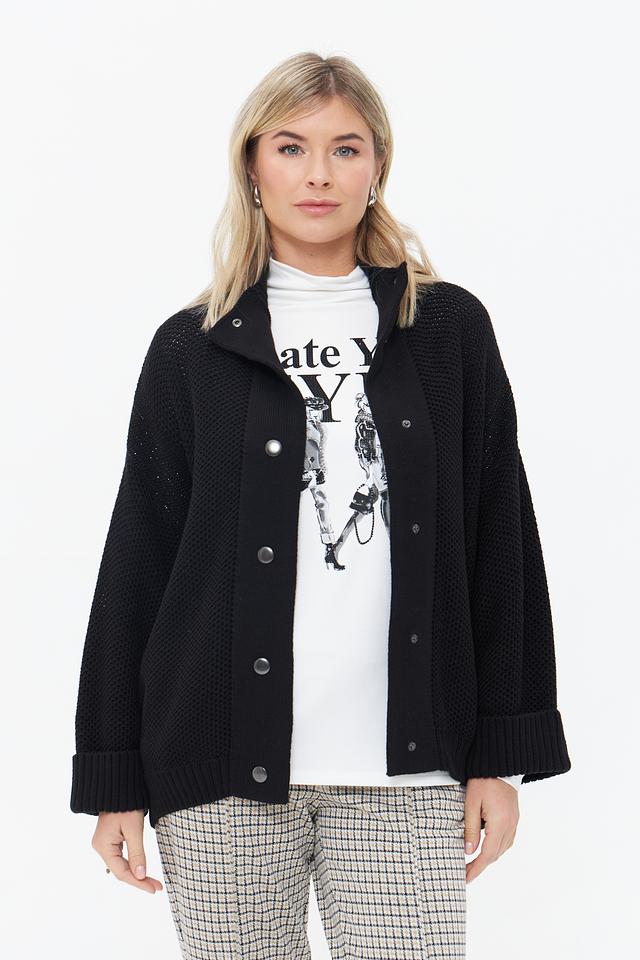 Чёрный вязаный жакет Monari свободного кроя с застёжкой на пуговицы. Модель выполнена из 100% хлопка, имеет объёмные рукава и фактурную вязку. Состав: хлопок 100%