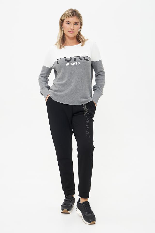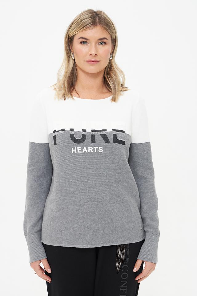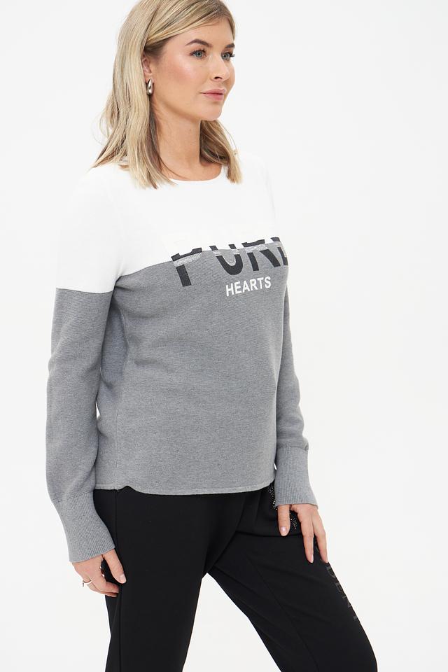 Дизайн пуловера выполнен в сочетании серого и белого цветов. Передняя часть украшена крупным принтом "Pure Hearts", который добавляет образу оригинальности и выразительности.