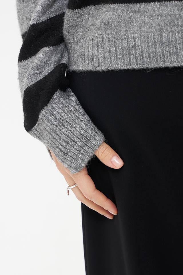 Этот пуловер от Monari станет прекрасным дополнением к вашему гардеробу. Модель выполнена в сером цвете с широкими черными полосками, что придает ей динамичный и современный вид.