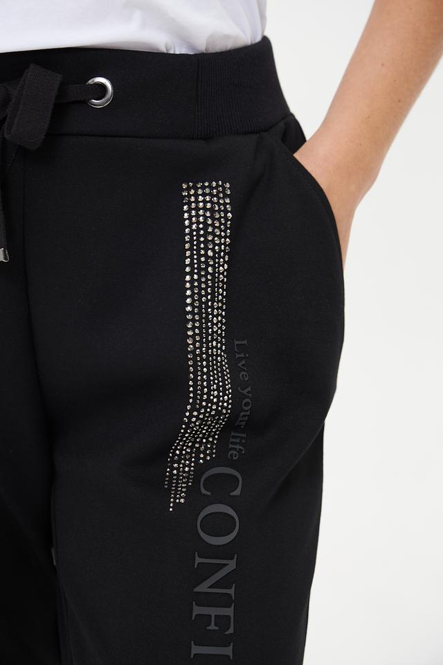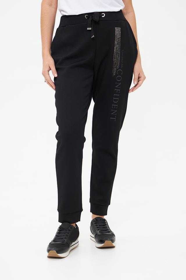Чёрные брюки Monari — это стильное и комфортное решение для повседневного гардероба. Модель выполнена из мягкой ткани с добавлением эластана, имеет удобный пояс на шнуровке и эффектный декор из страз и надписью "CONFIDENT". Состав: полиэстер 55%, вискоза 38%, эластан 7%