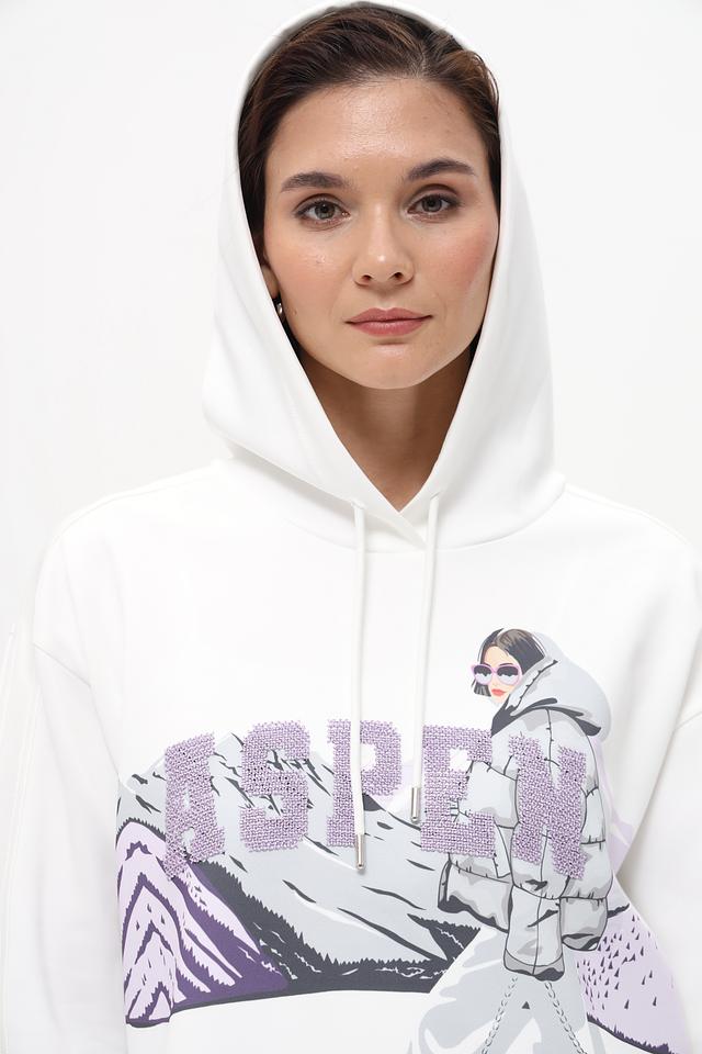 Этот стильный худи от Monari станет отличным дополнением к вашему гардеробу. Выполненный в белом цвете, он украшен эффектным принтом с изображением горнолыжника на фоне заснеженных гор.
