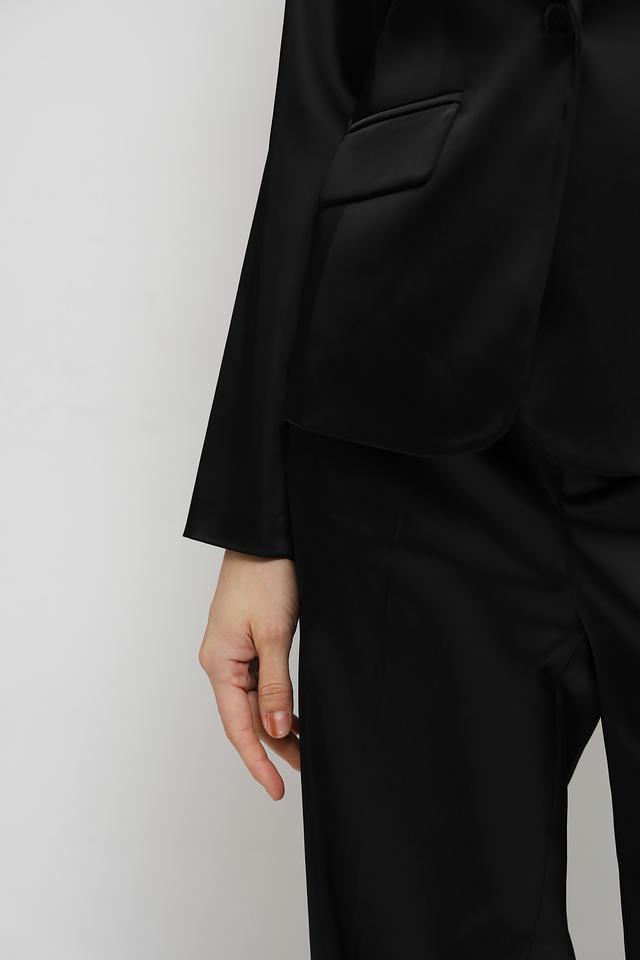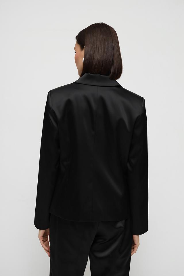 Жакет имеет классический крой с лацканами и застежкой на одну пуговицу. Прямые линии и минималистичный дизайн делают его подходящим для различных стилей и случаев.