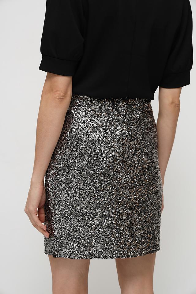 Юбка Monari серебристого цвета, полностью покрыта сверкающими пайетками. Изготовлена из 100% полиэстера, что обеспечивает комфорт и легкость в уходе. Состав: полиэстер 100%