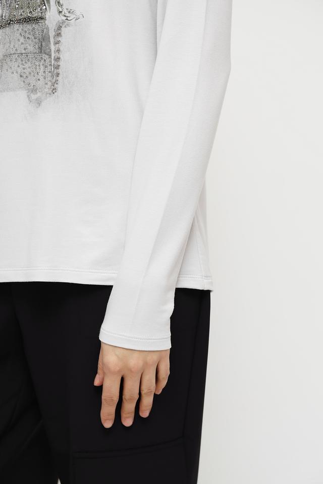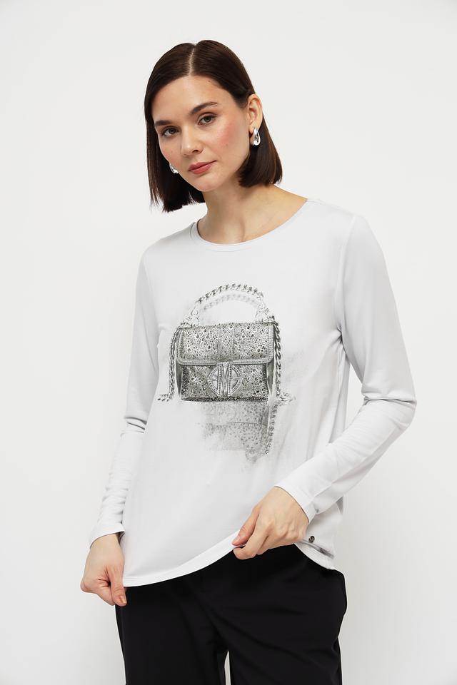 Белый лонгслив Monari с оригинальным принтом сумки. Изготовлен из мягкой и приятной к телу ткани на основе вискозы, модала и эластана. Состав: вискоза 45%, модал 45%, эластан 10%