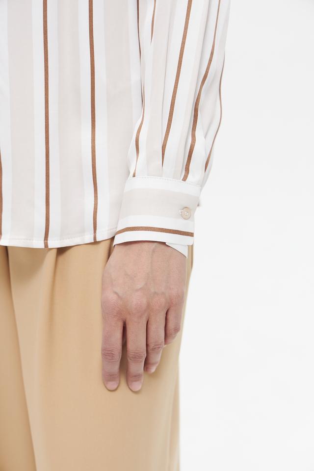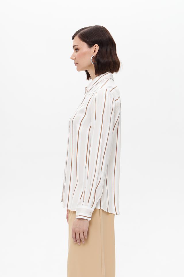 Блуза имеет классический крой с длинными рукавами и отложным воротником. Вертикальная полоска в бежевых и кремовых тонах визуально вытягивает силуэт и придает образу элегантность.