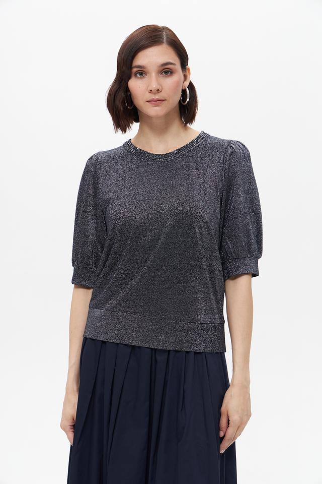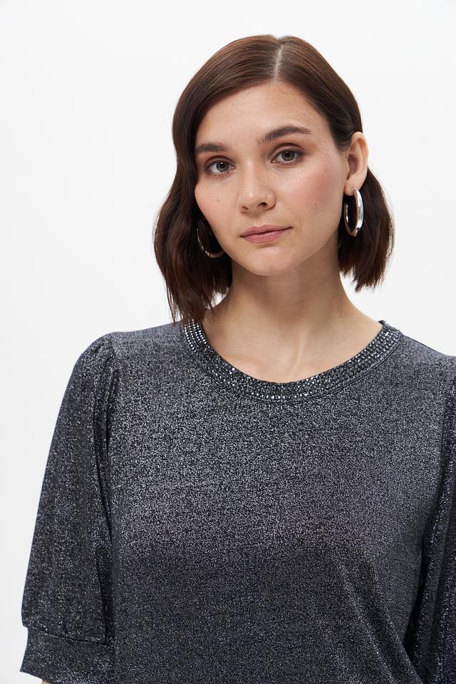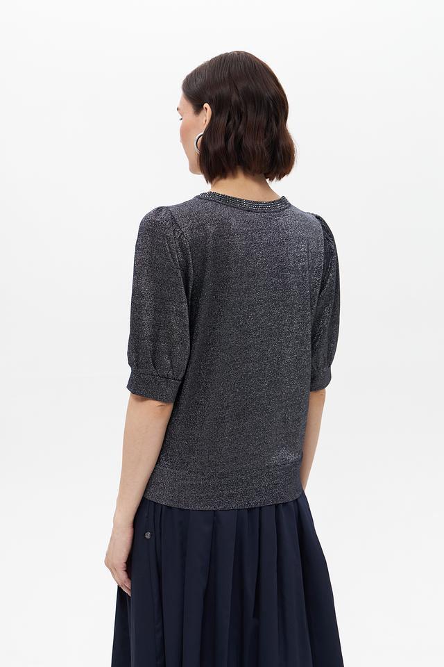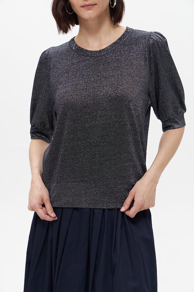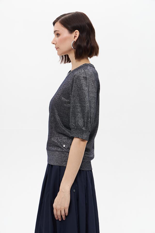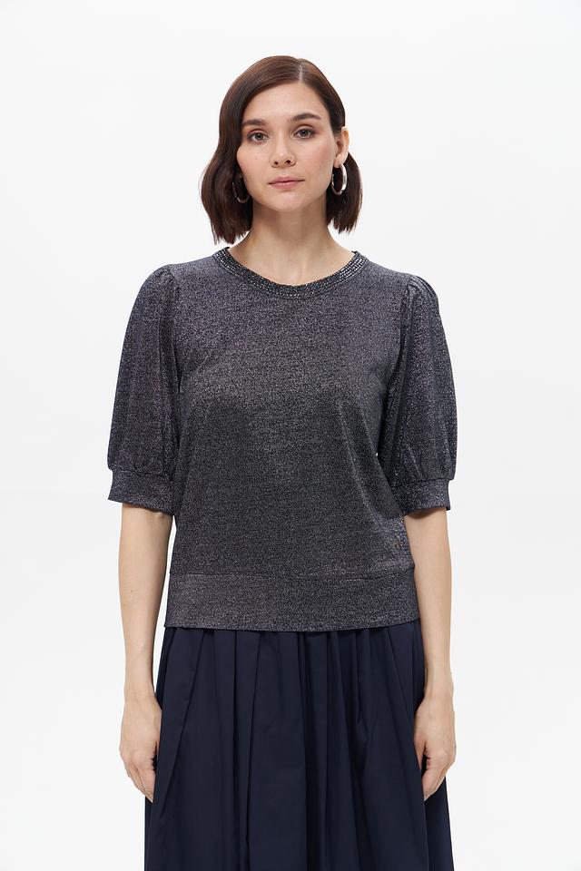 Модель имеет короткий рукав с небольшим буфом и круглый вырез горловины, украшенный деликатной отделкой из пайеток. Футболка имеет слегка приталенный силуэт, который подчеркивает фигуру.