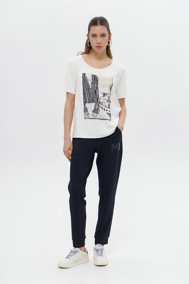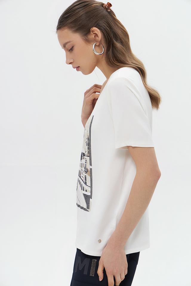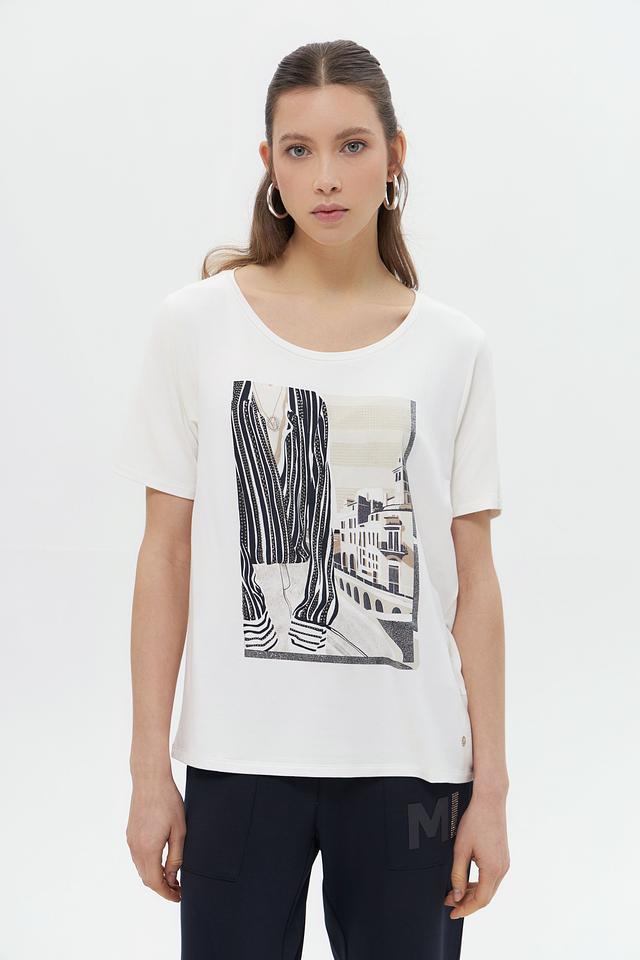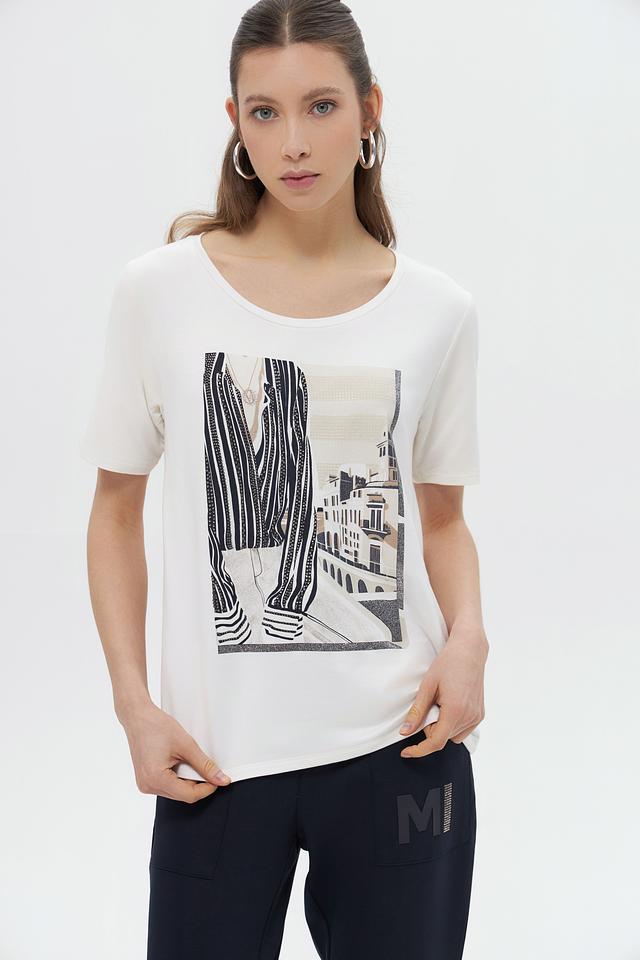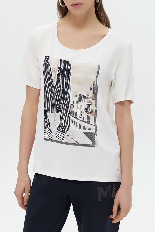 Белая футболка Monari с оригинальным графичным принтом. Изготовлена из мягкой вискозы с добавлением эластана для комфорта и хорошей посадки. Идеальный выбор для создания стильного повседневного образа. Состав: вискоза 95%, эластан 5%